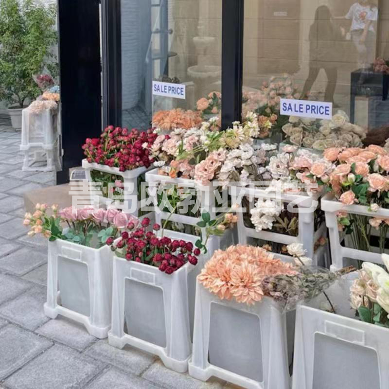 A single beige flower bucket, a single beige heightening rack, 10 beige heightening racks, 10 beige flower buckets, 5 beige buckets, 5 beige heightening racks, and a single white flower bucket, 10 white heightening racks