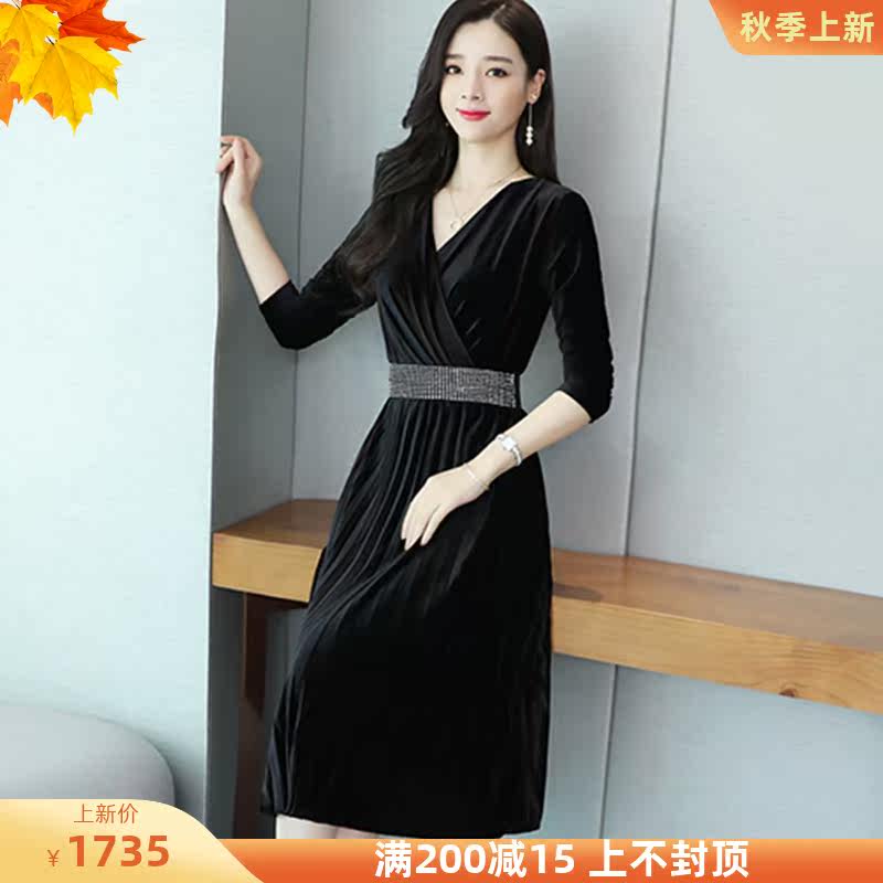 Shoutang dress women's 2022 new spring and autumn gold velvet V-neck waist and thin temperament bottoming ladies skirt
