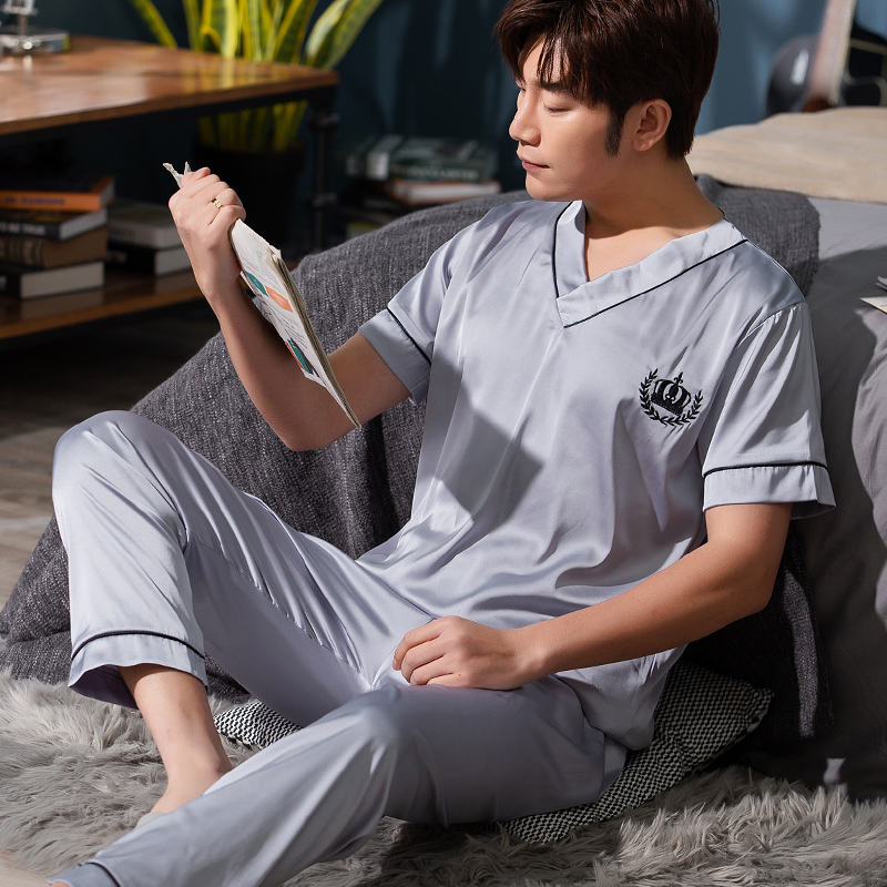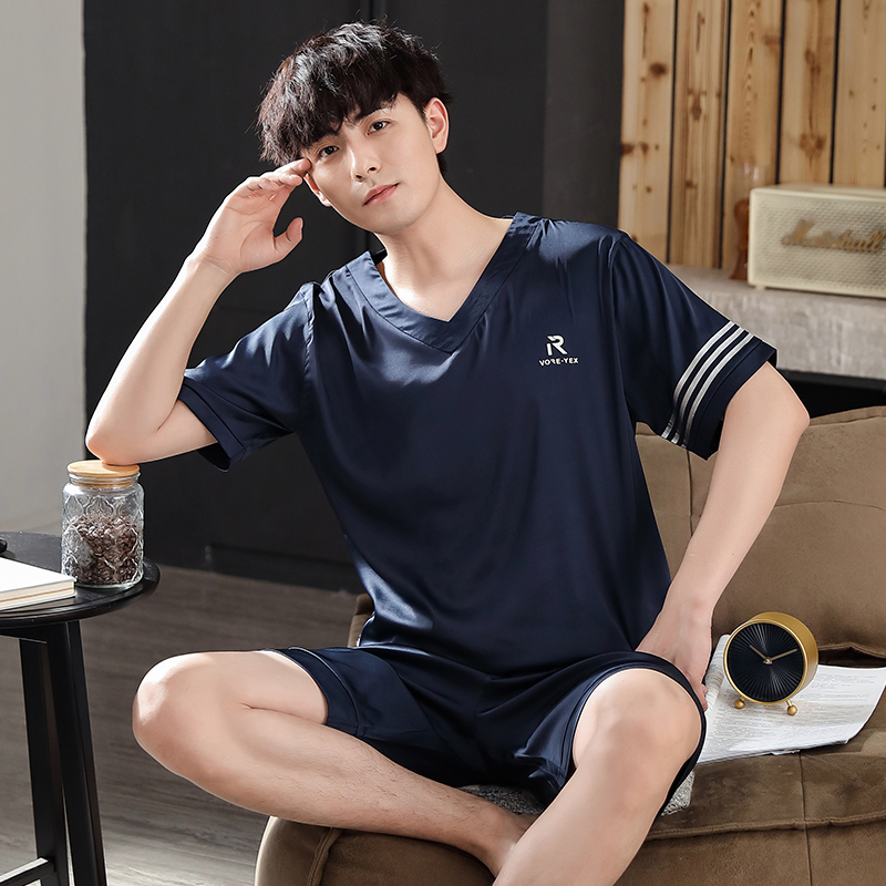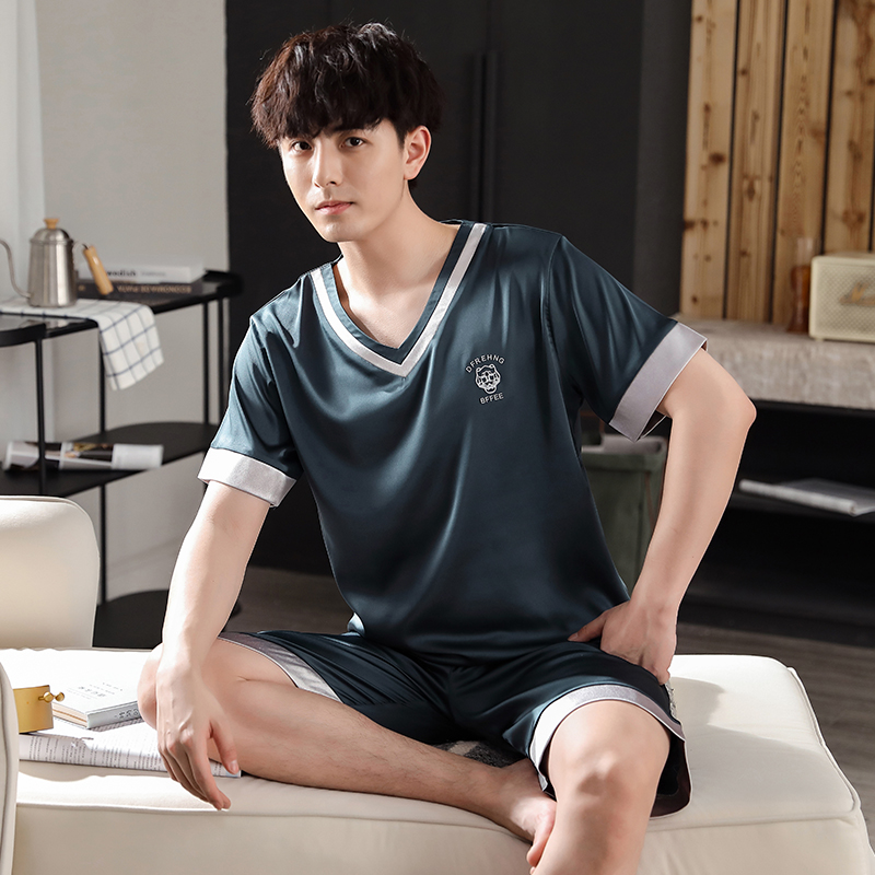 2022 new men's sleepwear summer thin pieces of ice silk short sleeve suit emulated silk V collar shorts casual home