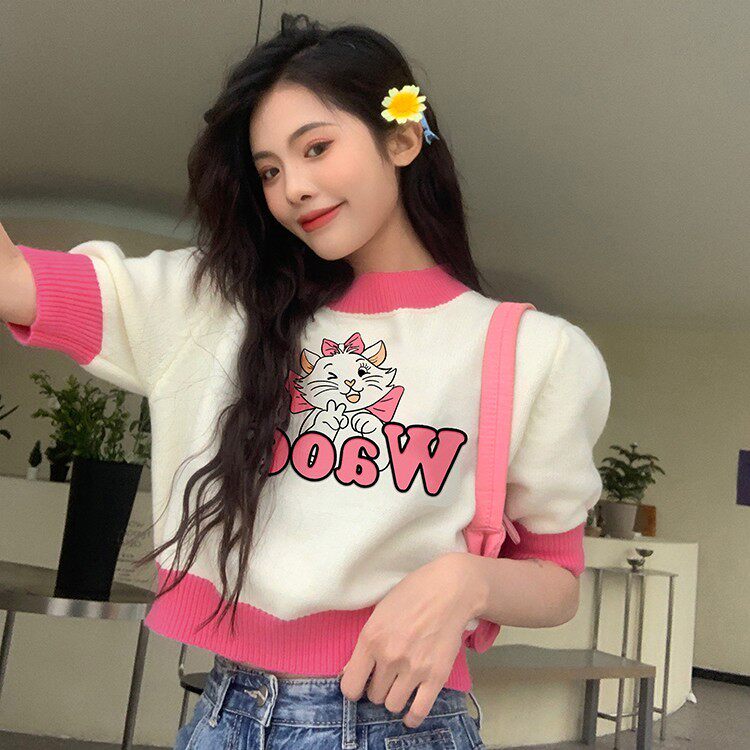 Collision Color Katong Kitty Short Sleeve Sweater 2022 Early Spring New Sweet and Don't To Wear Short-Knitted Blouse Blouse