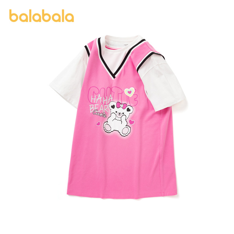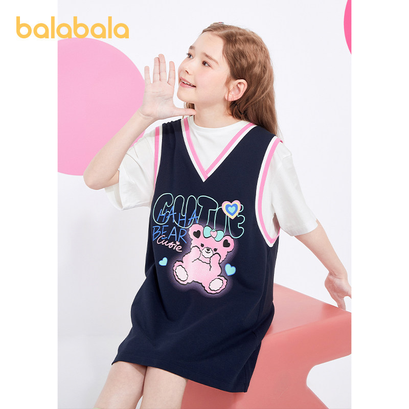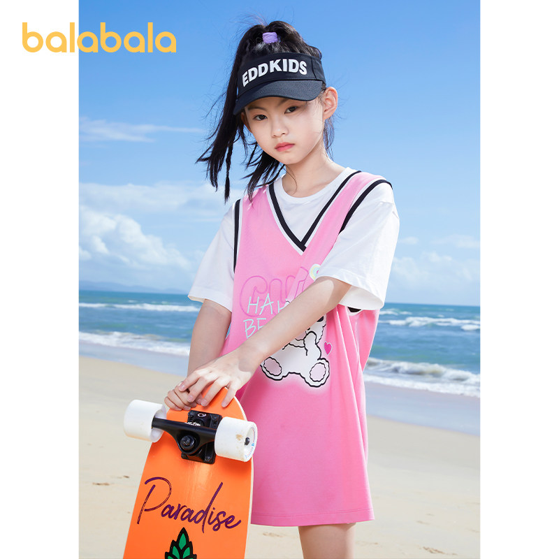 Barabala kids girls dress kids 2022 new style mid-to-day kids sports summer wear fake two pieces of sweet tide