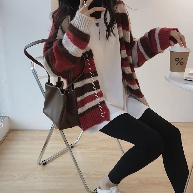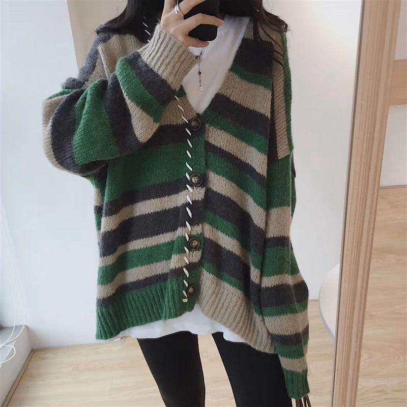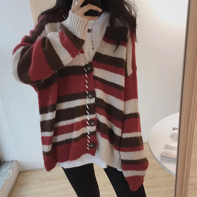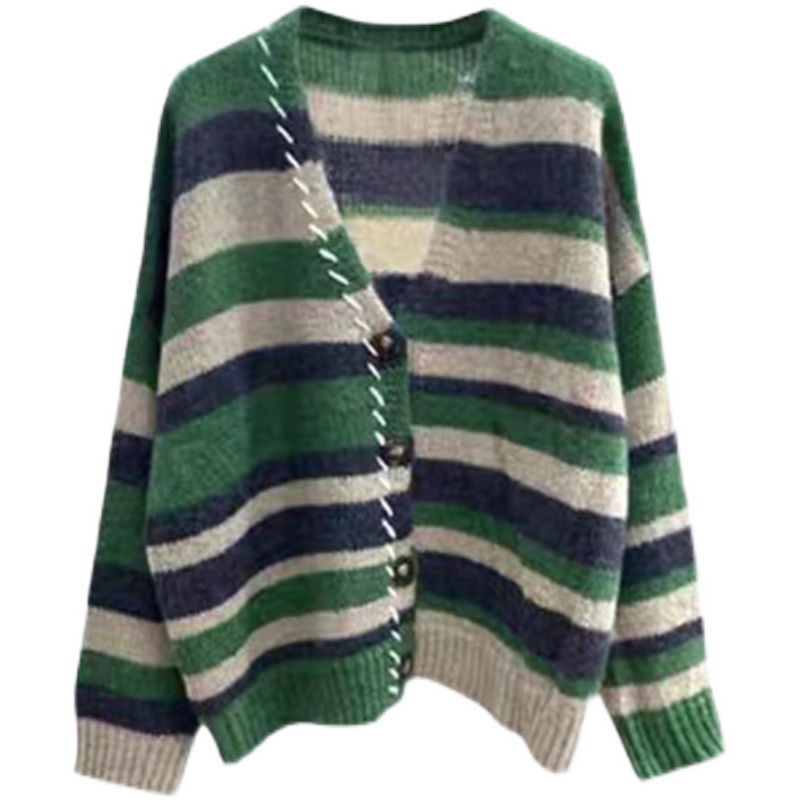 French maje22 spring small fragrant wind wool knit cardiovert retro style Lazy Wind Striped Sweater Jacket Woman