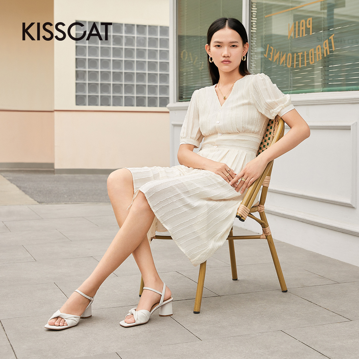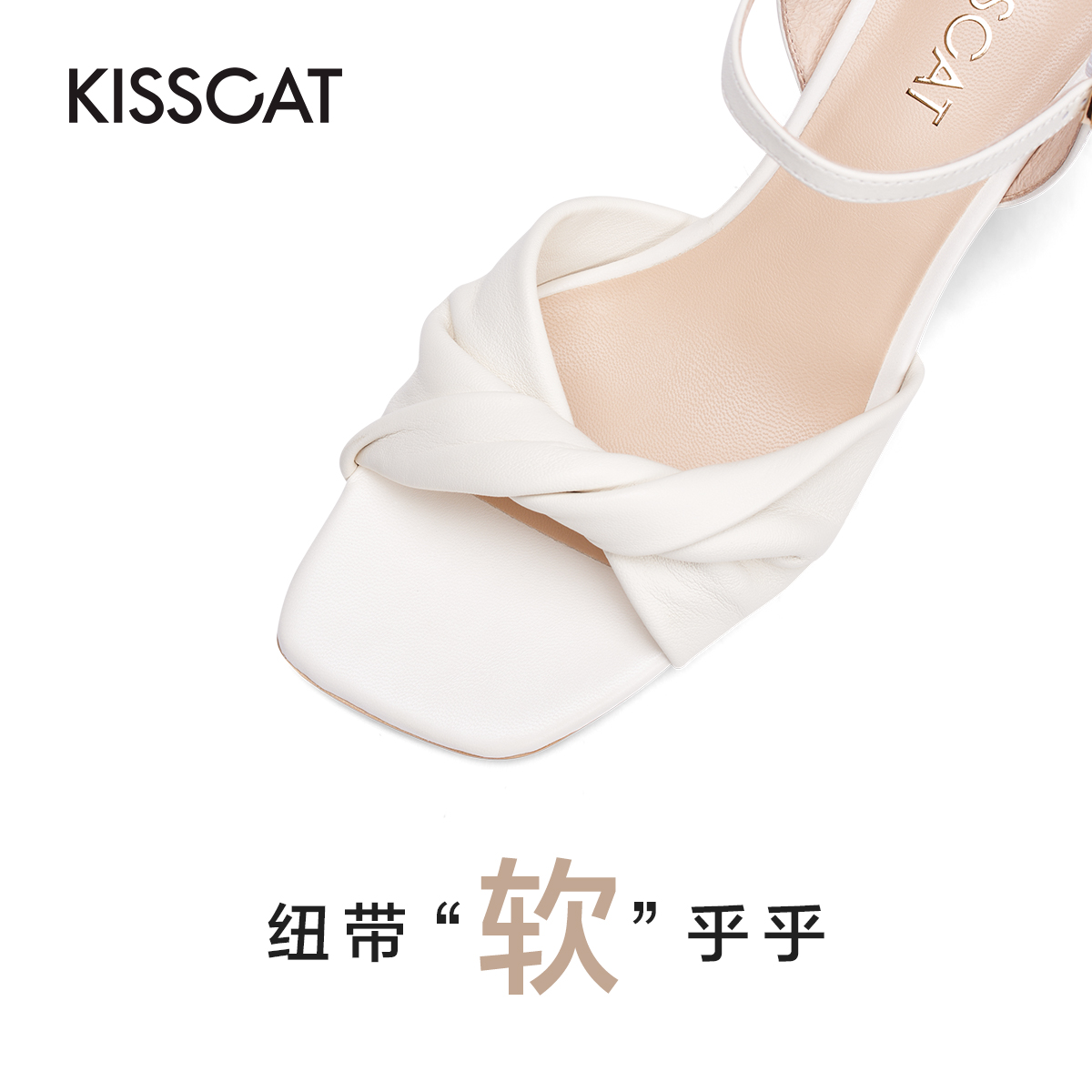 Kissing cat 2022 Summer new retro goat leather fairy wind with square head coarse heels with fashion high heel sandals