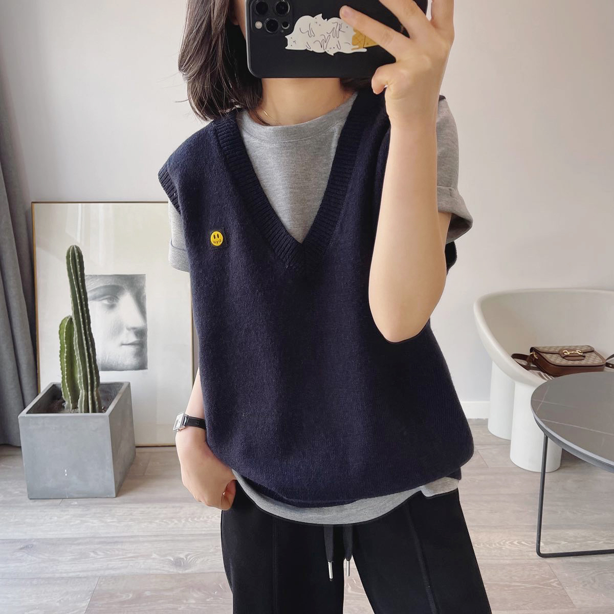 Vitality and age reduction Korean version of the smiley face car sticker striped V-neck knitted vest women's autumn loose sleeveless sweater vest