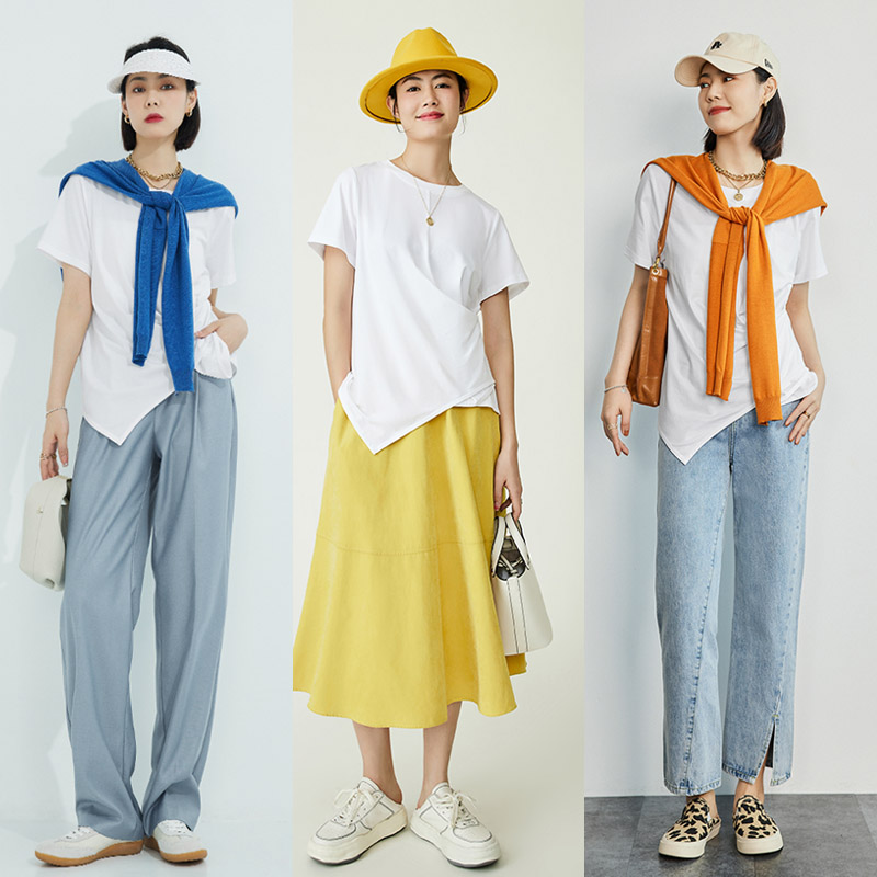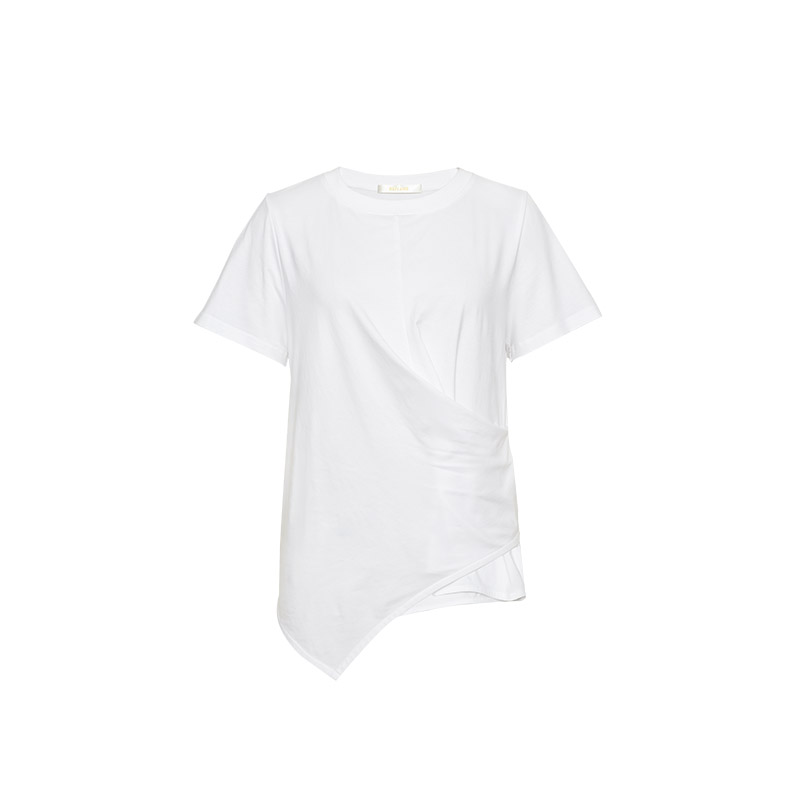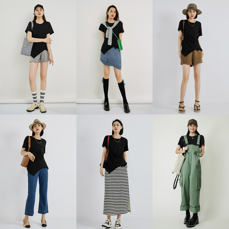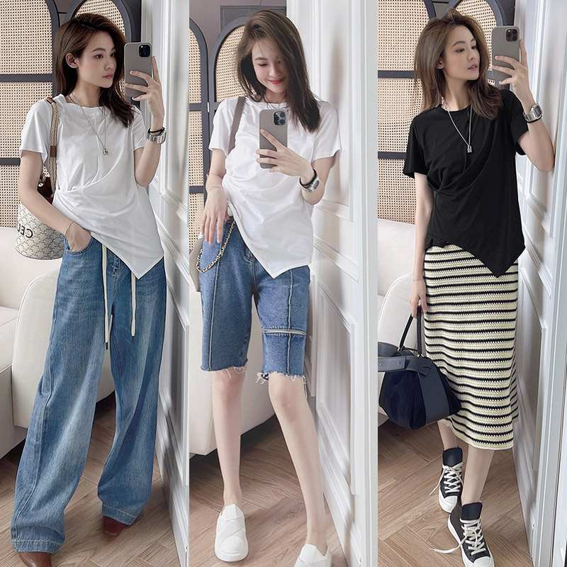 Meiyang MEIYANG Floating Clouds Mille-feuille T-shirt Slip simple black and white irregular waist crew neck short sleeve top