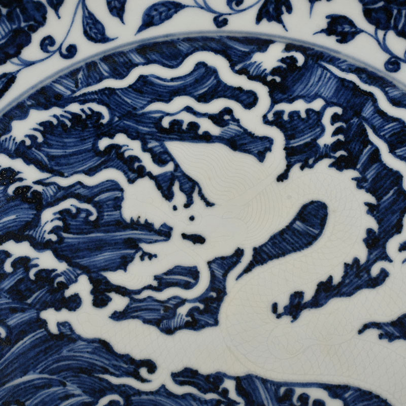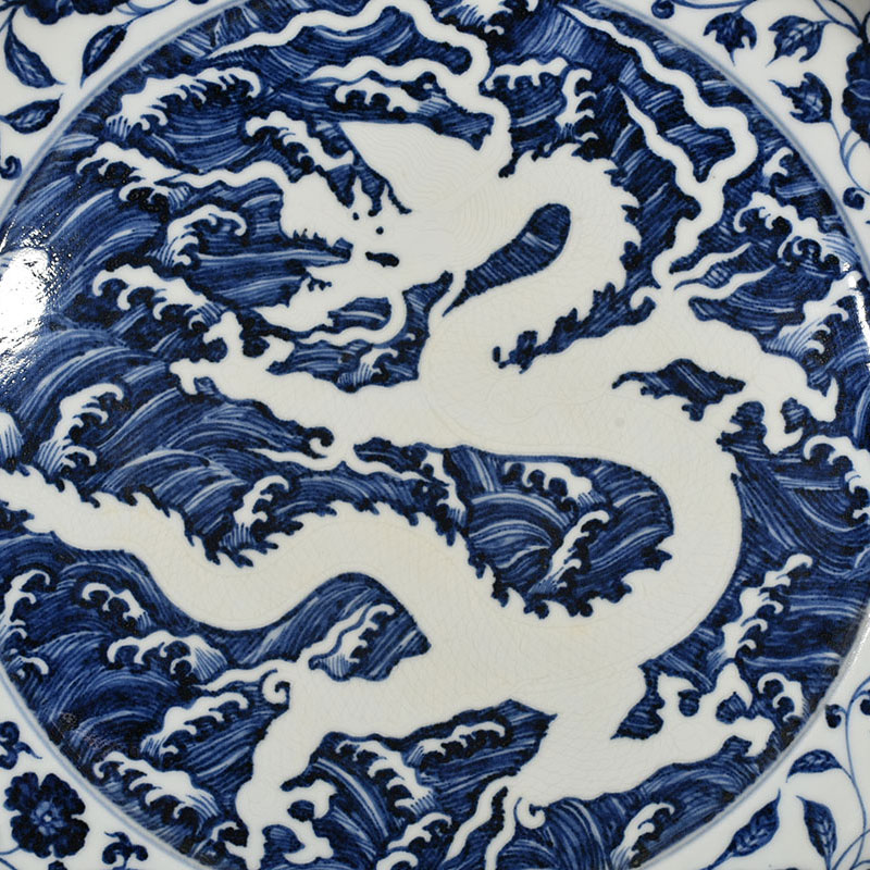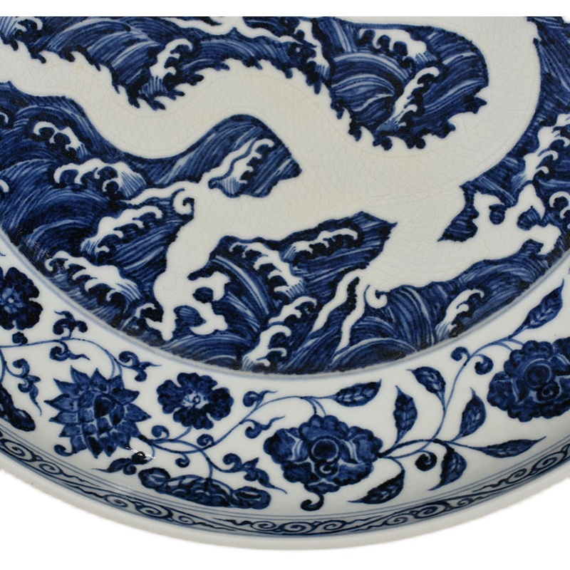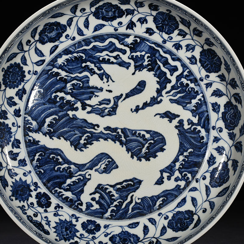 Ming Yongle Blue and White Seawater Carved White Dragon Plate