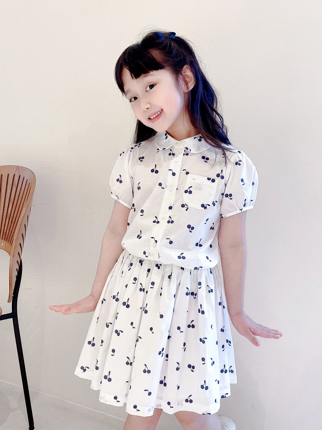 Girl White Cherry Shirt Half Skirt Suit Meta-Treasure Collar Bubble Sleeves Shirt With Plexu Skirt
