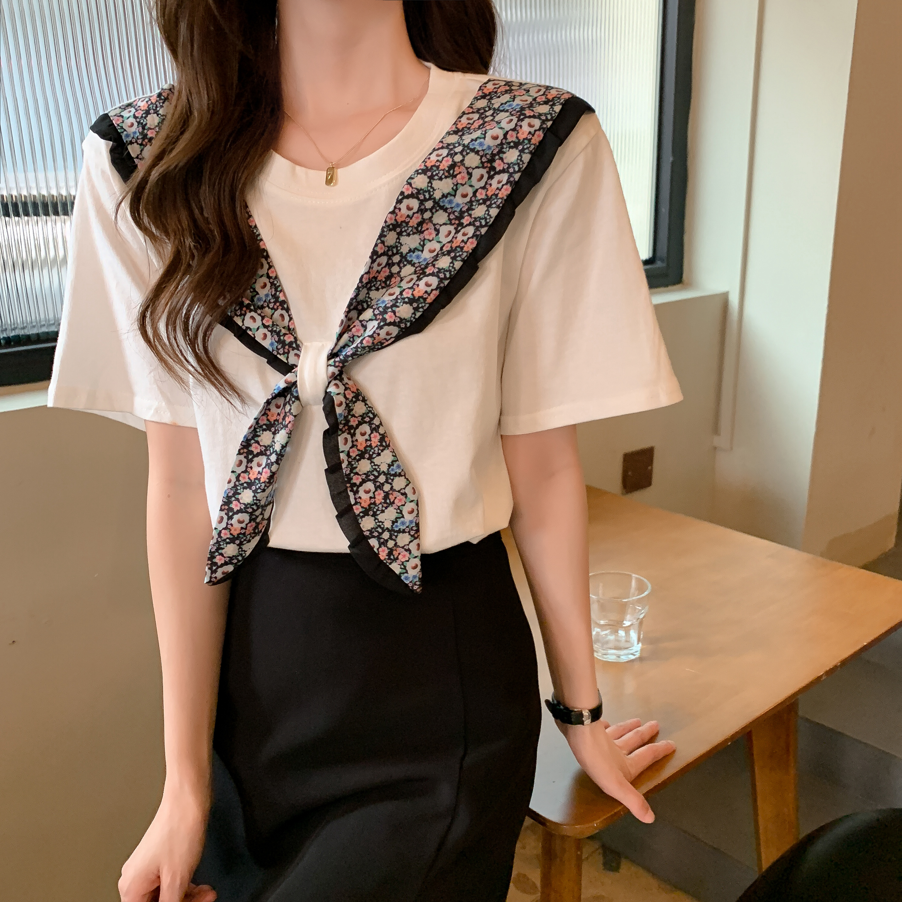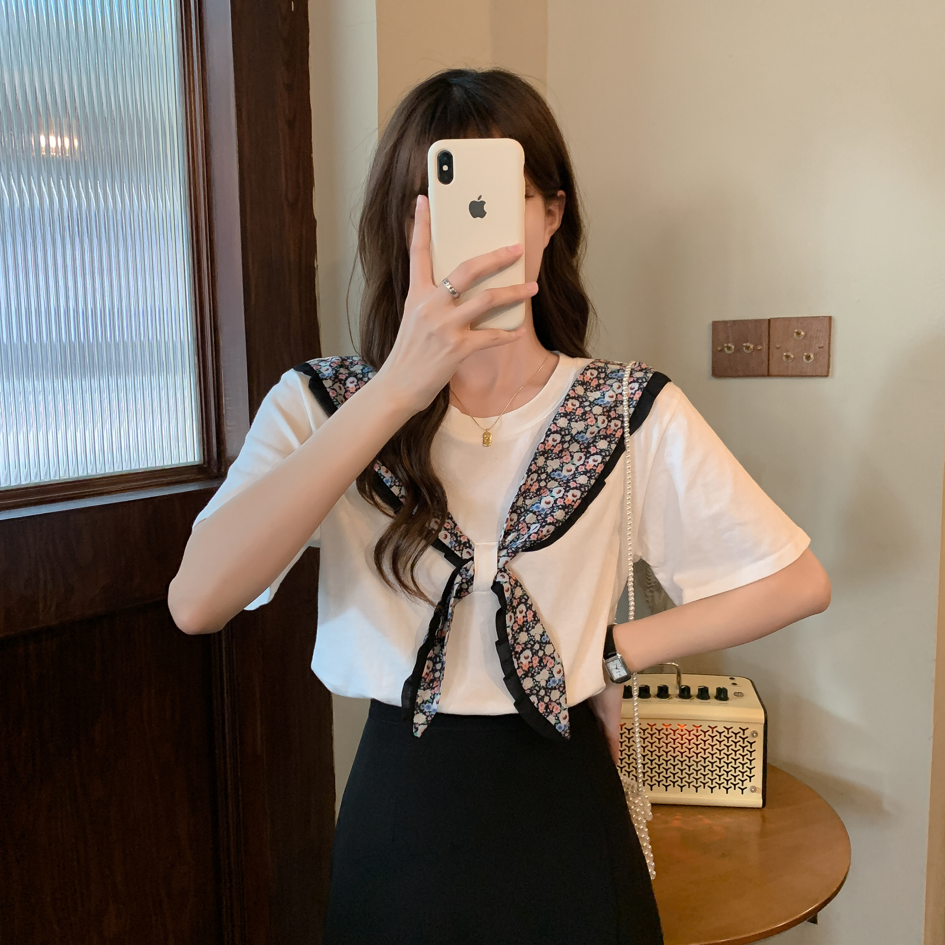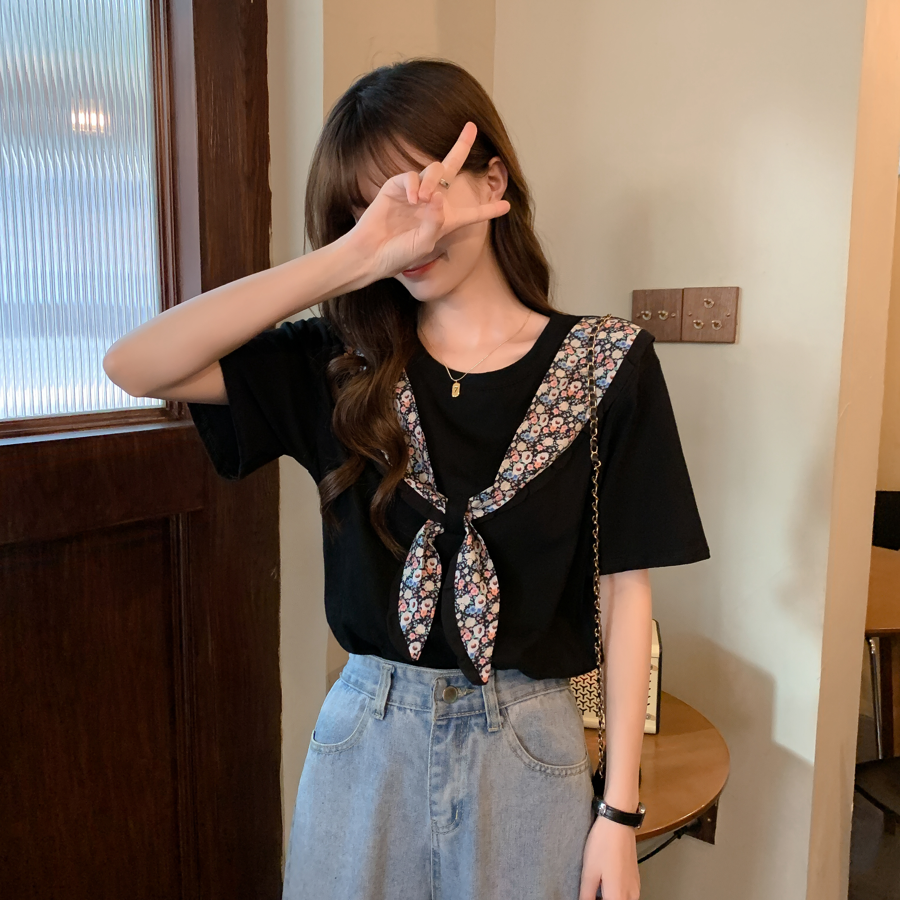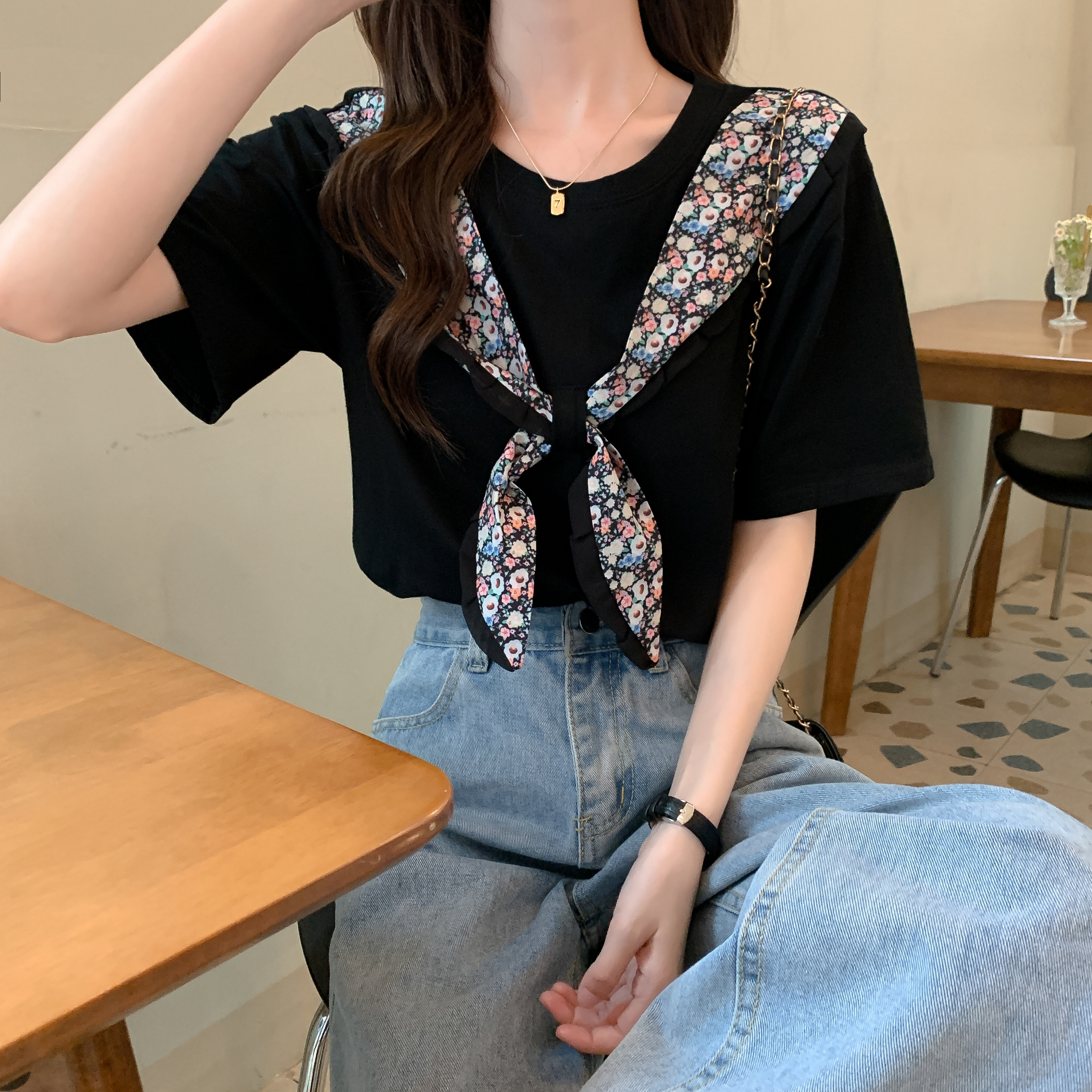 Large size women's clothes design sensitive flowers and false two pieces of thin T-shirt butterfly tie with a coat