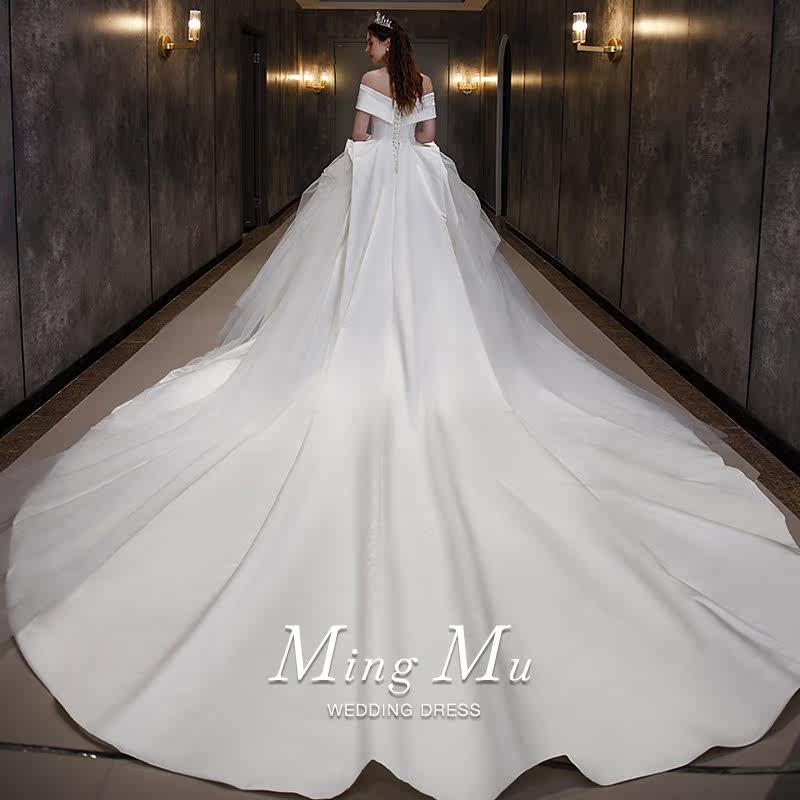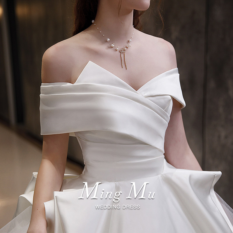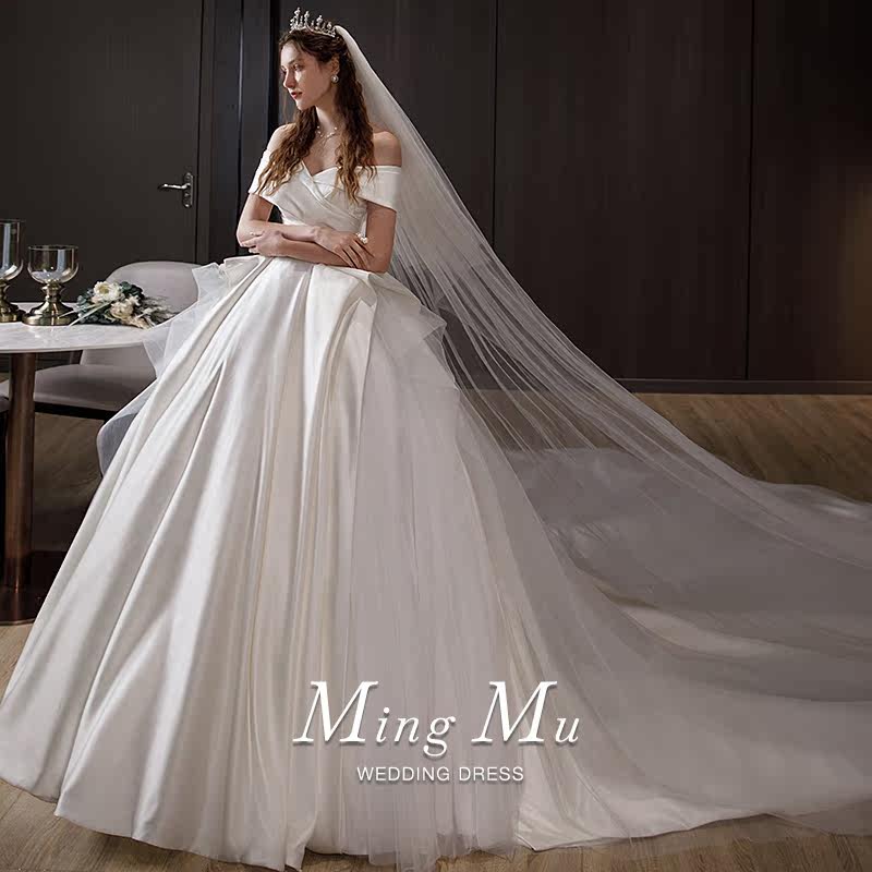 The French satin main wedding dress 2022 new bridal lady small tug tail retro luxurious luxurious advanced texture lined shoulder