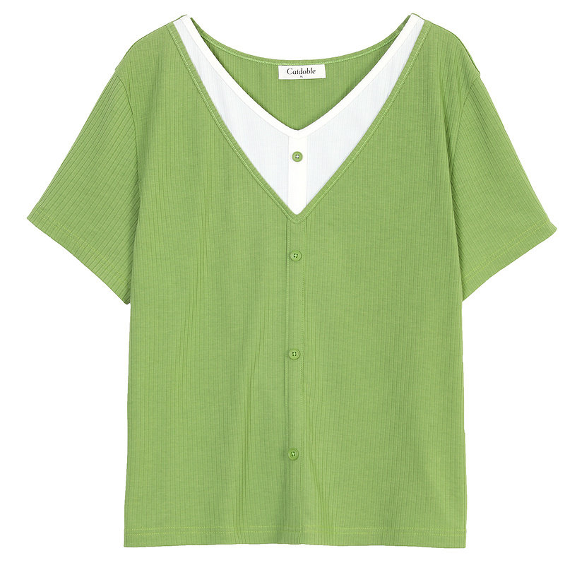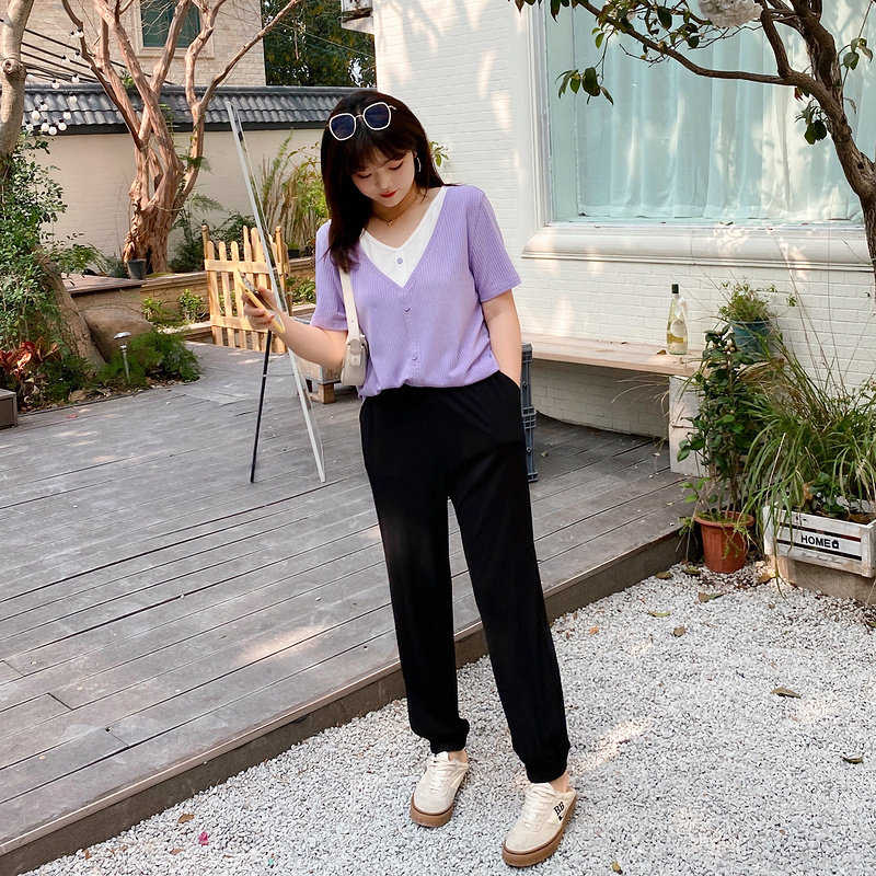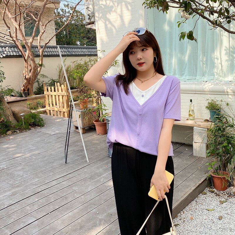 Multi-treasure 2022 Summer new Korean version V collar conspicuble two knit large size Fat mm Conspicuble Short Sleeve T-shirt Woman