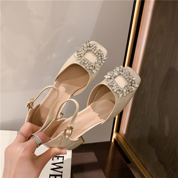 Ultra-genuine Giant good looking net red water drill square buckle in heel Temperament Fairy Baotou sandals Mary Jane shoes Single shoe