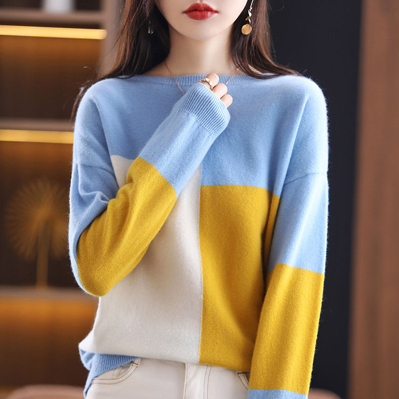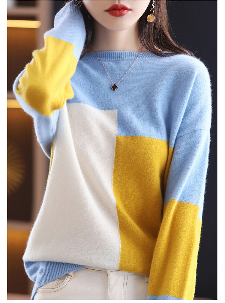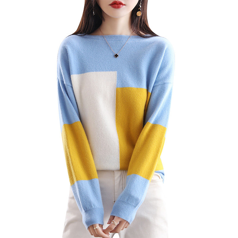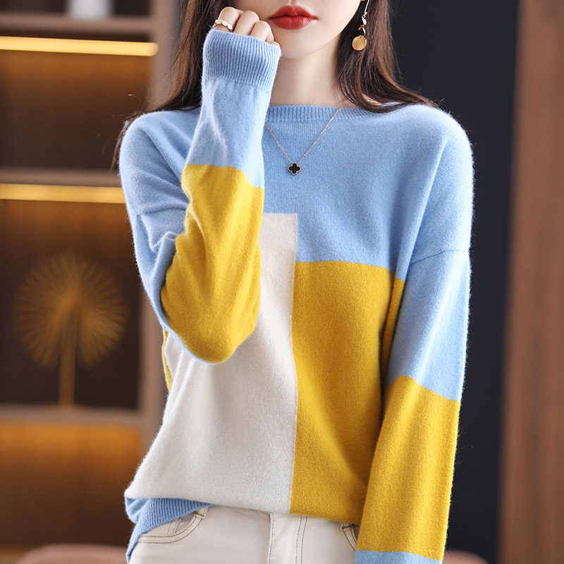 New women's clothing 2022 autumn and winter contrast color cashmere sweater loose pullover color matching wool sweater soft waxy sweater