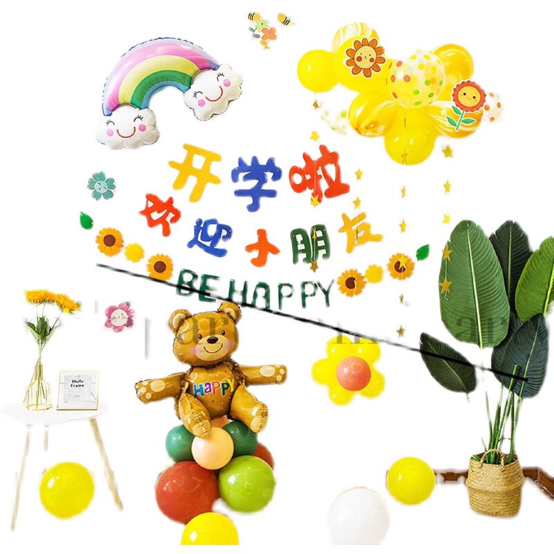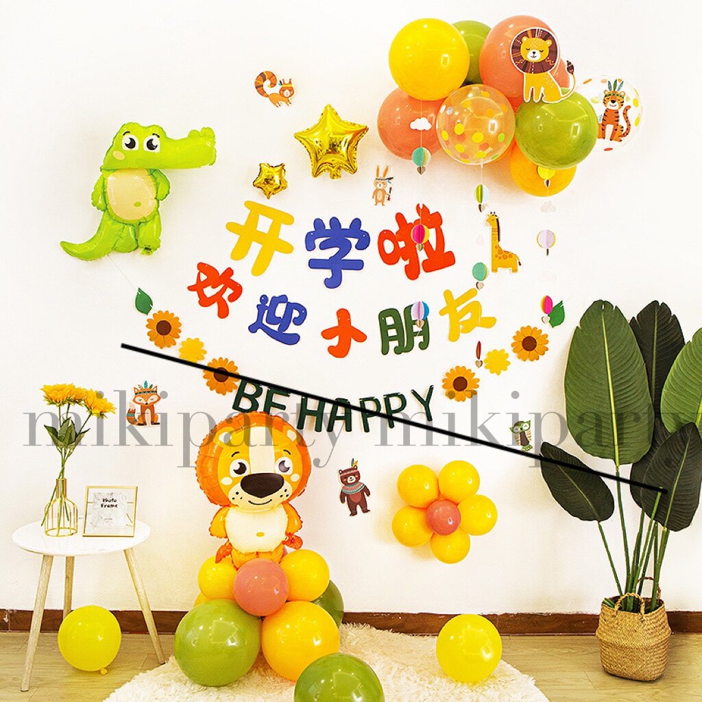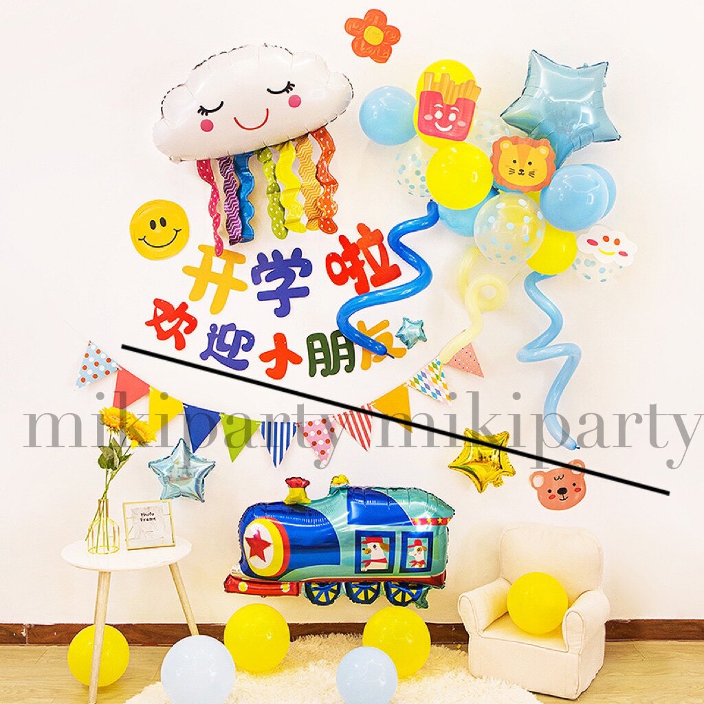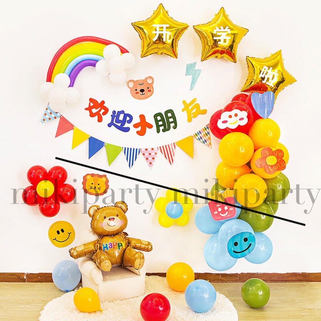 Let's start school. Balloon decoration welcomes children. Kindergarten classroom ceremony season. Scene layout background wall