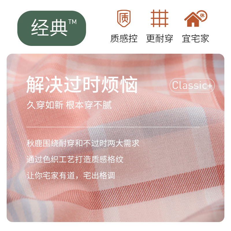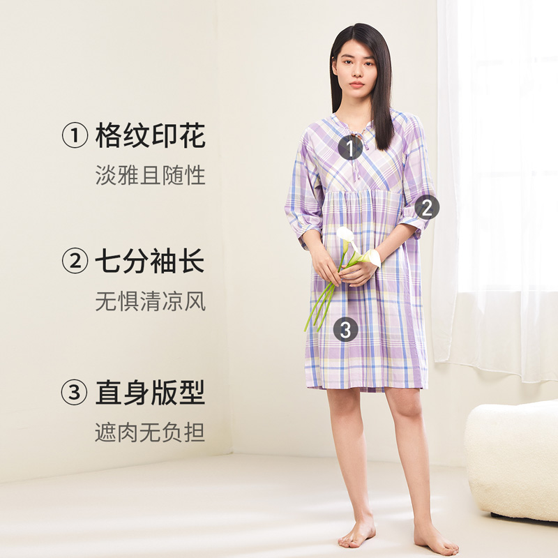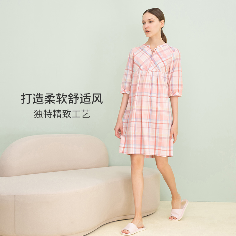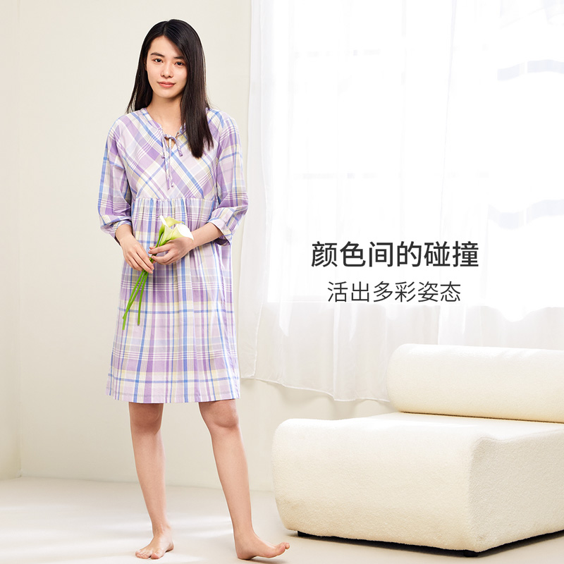 Autumn Deer (Classic Department) Summer Sleeping Dress Women's thin section V collar texture Control 70% sleeves pure cotton plaid summer dresses