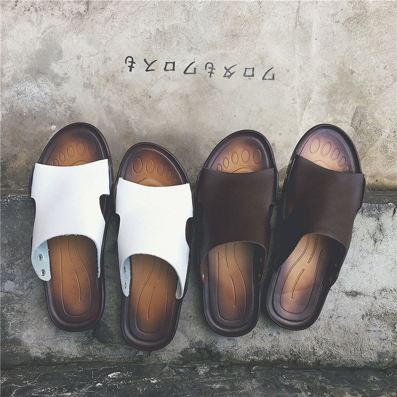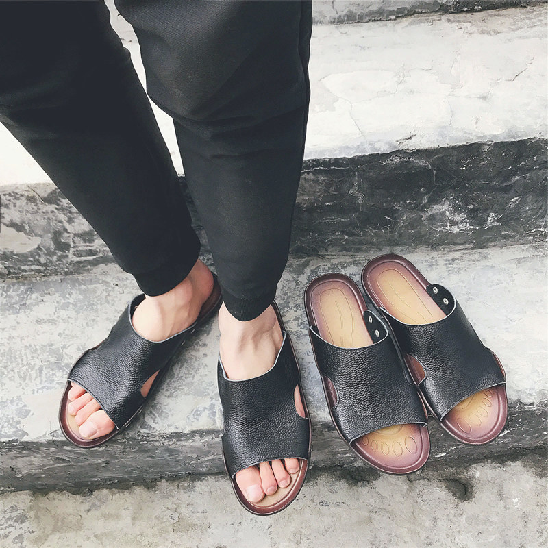 Word-lined male tide non-slip waterproof genuine leather slippers male beach semi-tugging driving slippers outside wearing soft-bottom men cool slippers