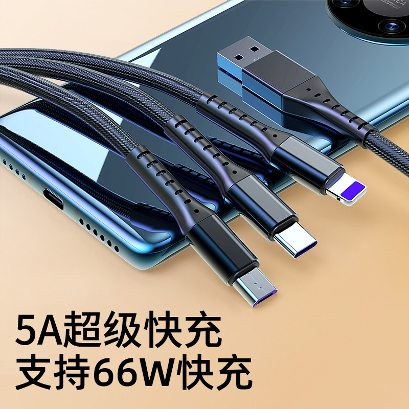 (66W super fast charge) One drag three data lines 6A Three-in-one phone charging wire machine Three heads apply Huawei Apple sparkling two-in-one bulls triple multi-purpose vehicle car punch x