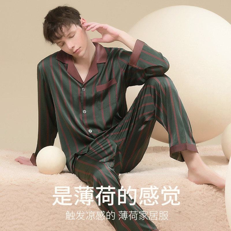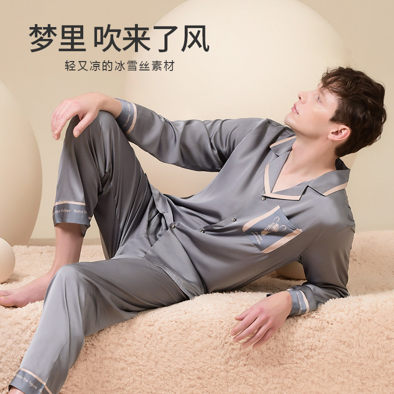 Sleepwear men's spring and autumn models Long sleeves Ice Silk Home Superior Sensation Summer Thin models Emulated Silk Suit Four Seasons