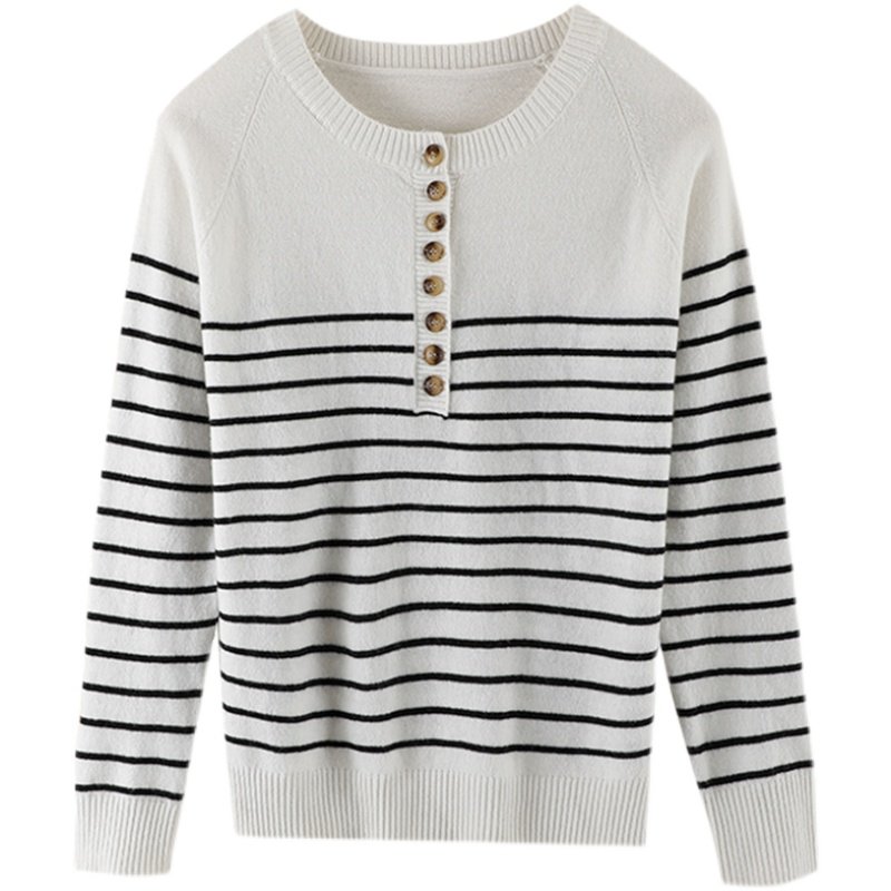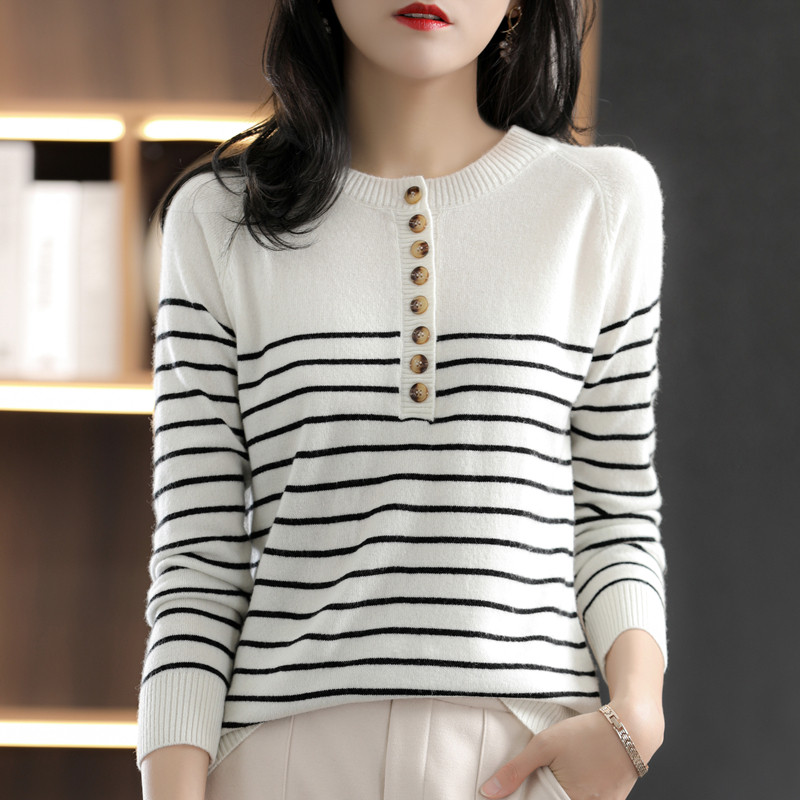 100% cotton knitted sweater women's round neck striped loose button sweater 2022 autumn new style outerwear long-sleeved thin top