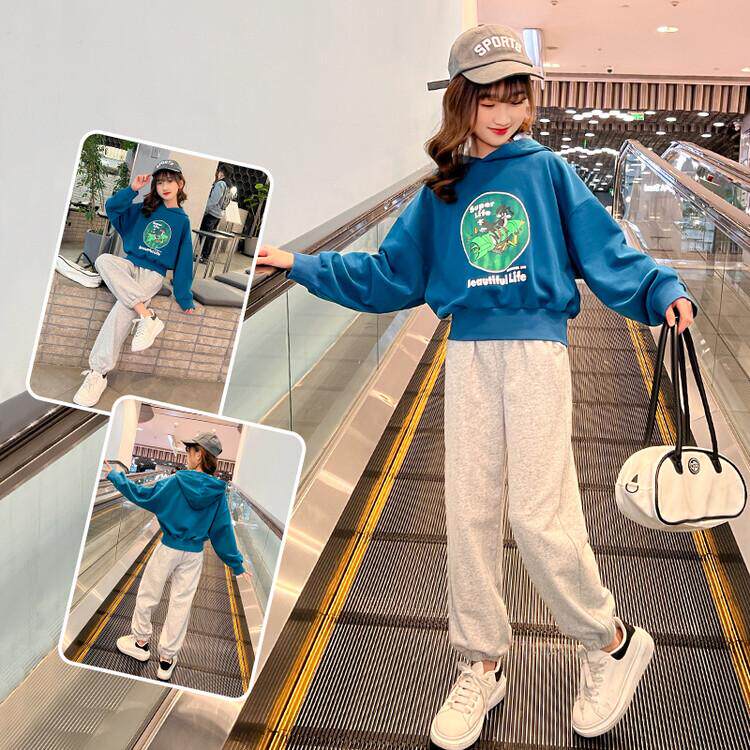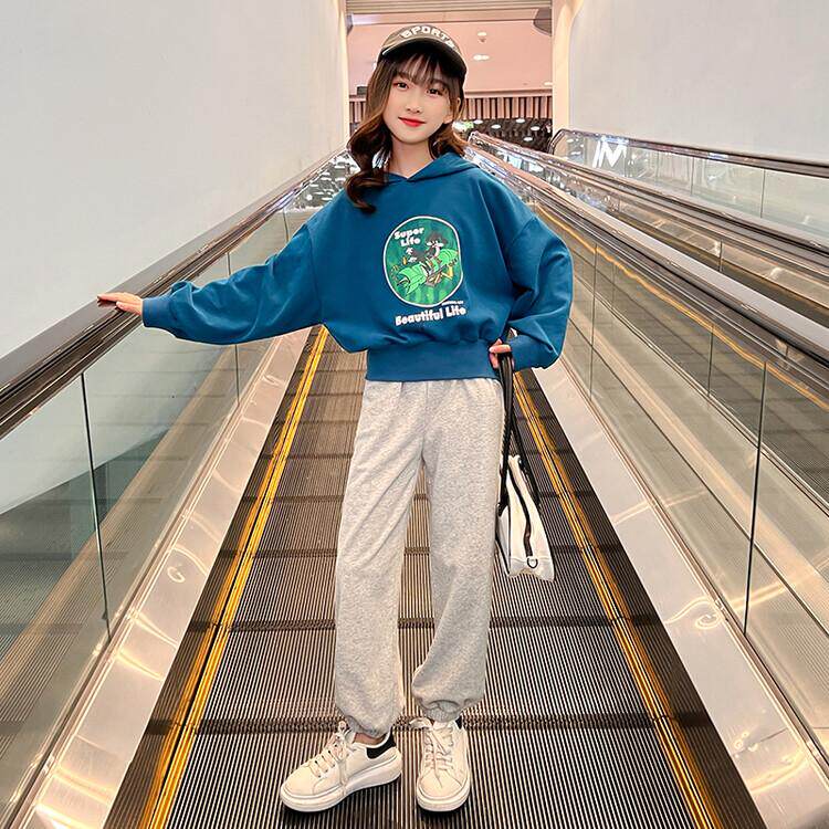 Spring suit girls 2022 new cotton blue net red foreign style children's sweater short hooded fashionable big boy