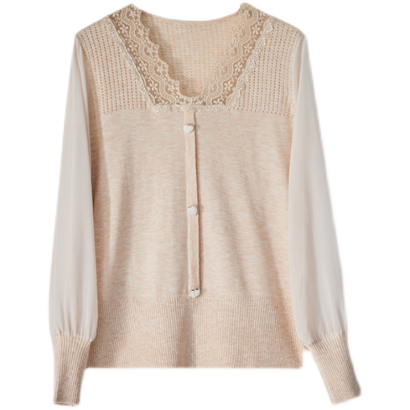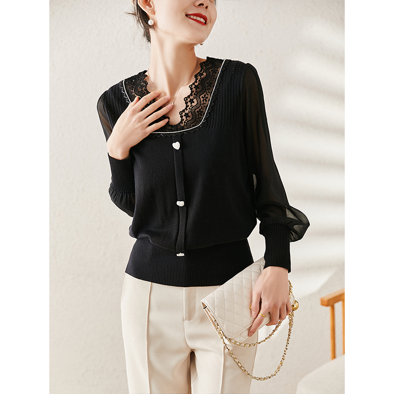 Elegant Hollowed-out Lace Splicing Wool Stitch Weaselwear Women Spring 2022 New Gentle Blizzard Spinoff Foam Sleeve Blouse