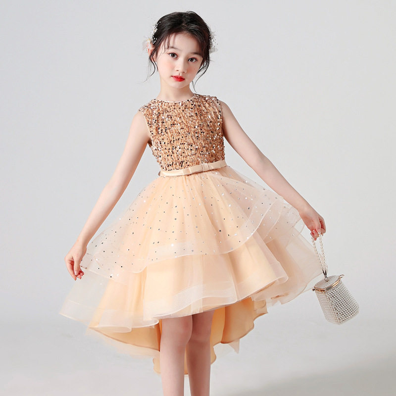 Zhongda Girls White New Trailing Dress Princess Dress Girl Host Performance Dress Mesh Puffy Skirt