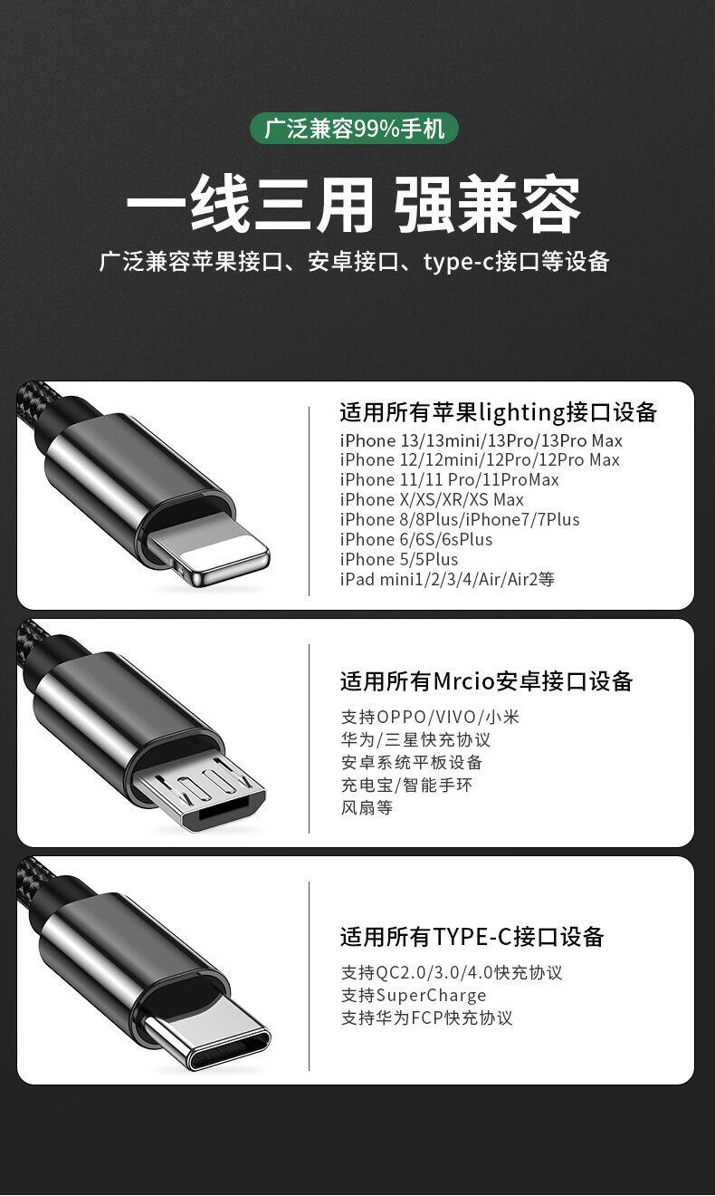 1 2 m -- one tug of three -- ink black (66W super fast) Android Apple type-C 1 2 m -- one drag three -- dark green (66W super fast-charged) Android Apple T