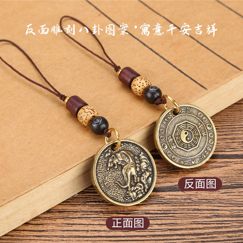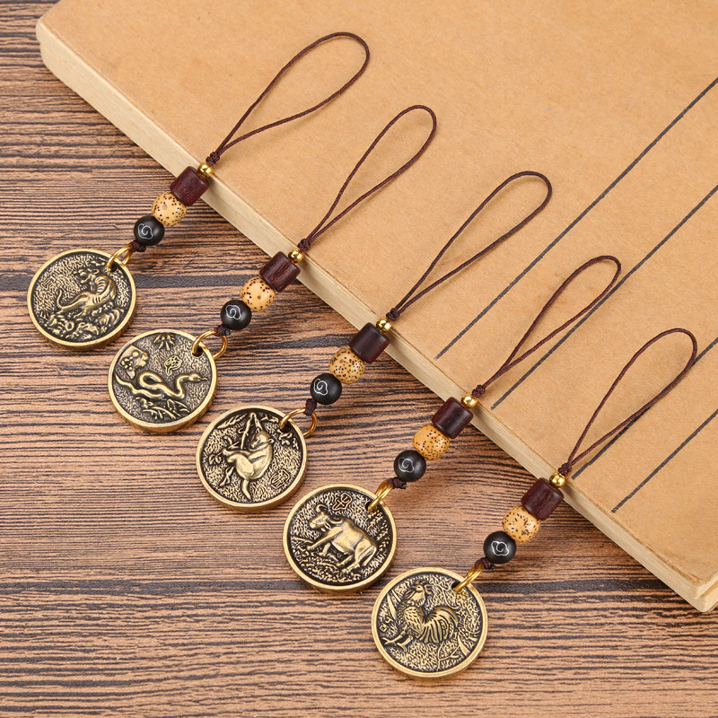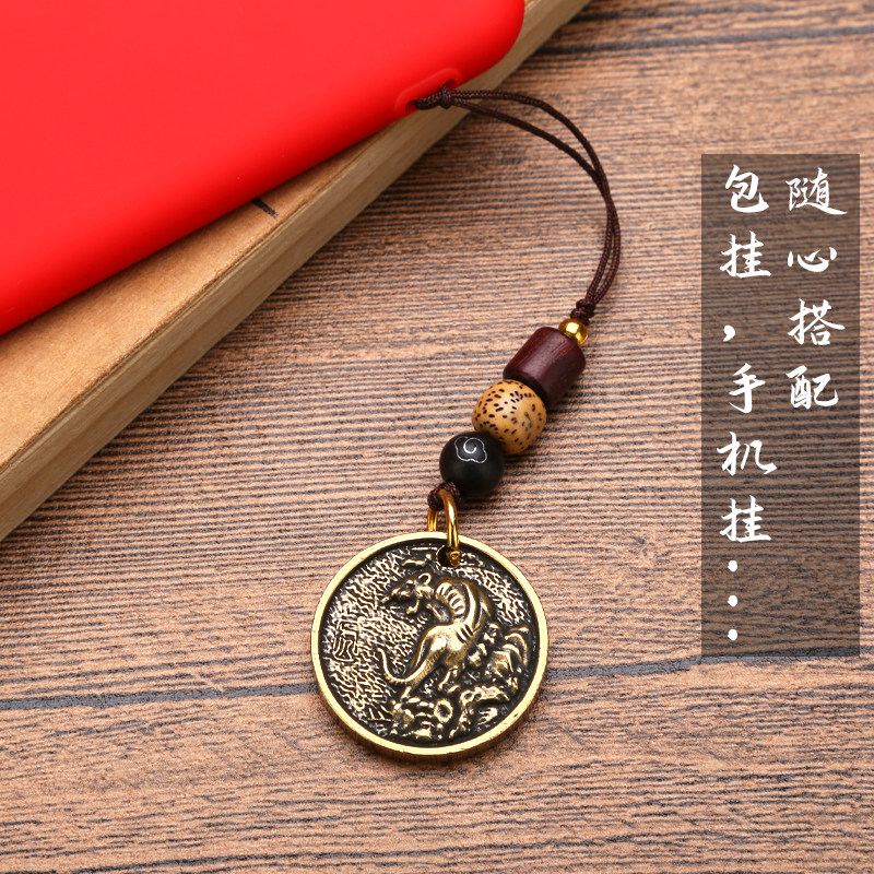 Zodiac Creative Ancient Wind Mobile Phone Pendant Accessories Rope Pendant Decoration Anti-Loss U Pan Sandalwood Pendant Handwoven Hanging Rope Pure Copper Applicable Apple Huawei Mobile Phone Hanging Rope Car Key Trick The Tiger