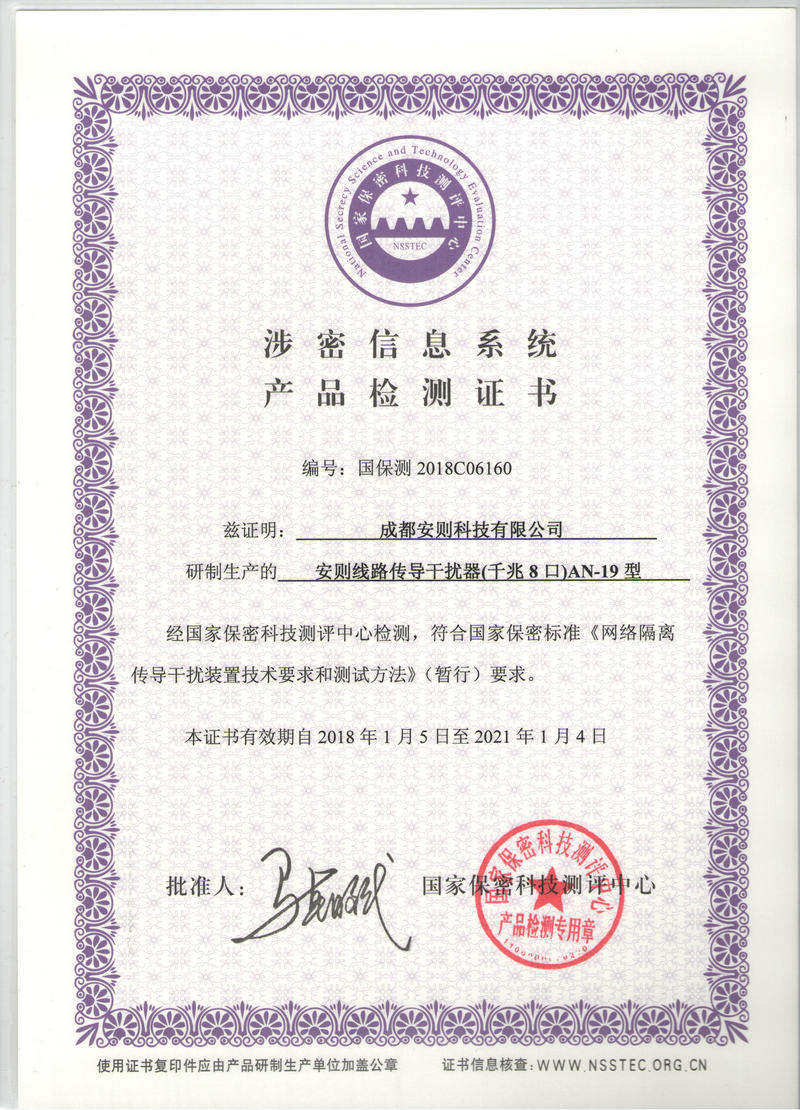 Network line conduction jammer Anze AN-19 Ethernet protection National secret certification