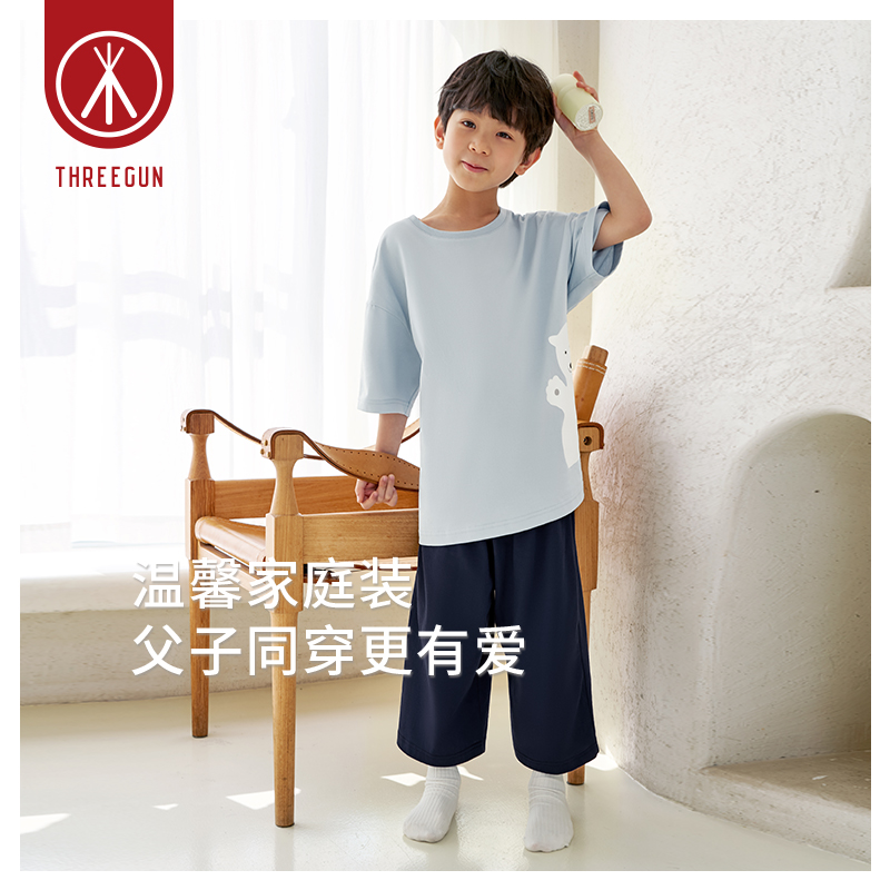 Three Guns Official Flagship Store Sleeping Suit Pants Set Men Short Sleeve Shorts Moisture Hygroscopic Speed Dry Round Collar Thin man's home jacket