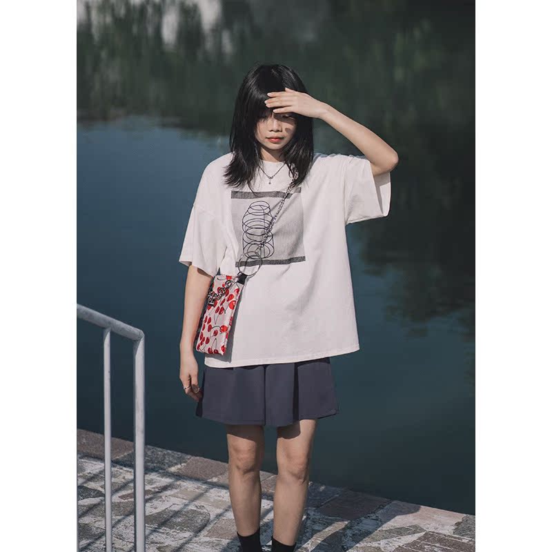 Design sense patterned printed T-shirt female summer short sleeve loose with slim 100 lap casual round collar white blouses
