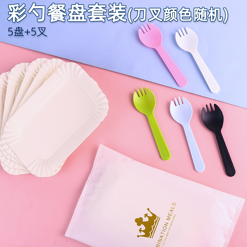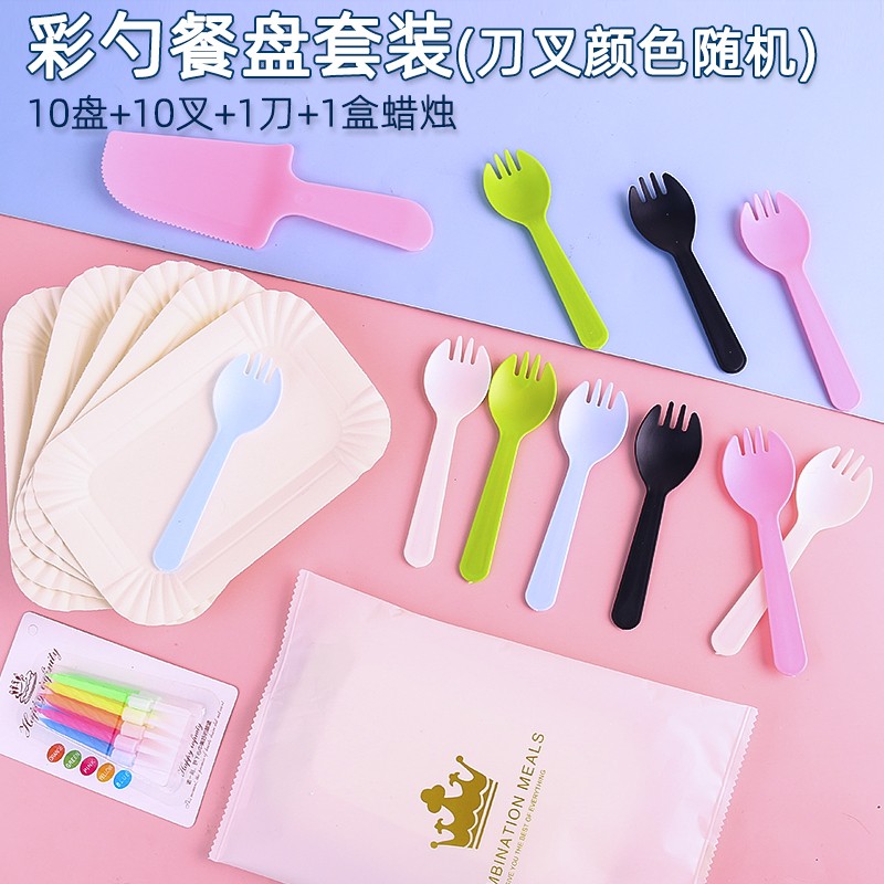 Milky white rice white white white color round five pitchforks-black 10 cover round five pans-transparent 10 sets of colorful spoons 5 disc 5 forks 5 disc 5 fork 1 Knife Color Spoon 5 Disc 5 Fork 1 Knife 1 Candle Color Spoon
