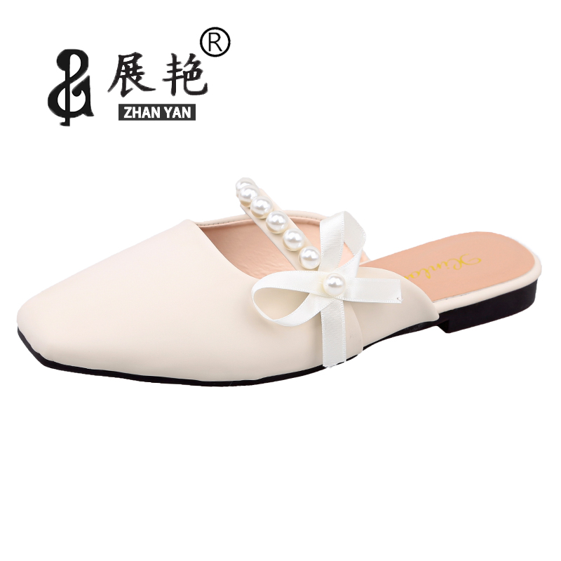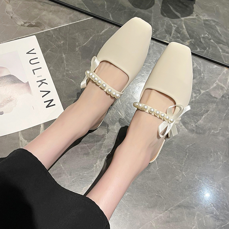 Baotou slippers women 2022 Summer new exterior wearing cool towed pearls Half slippers flat bottom square head mesh red Mueller shoes