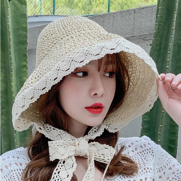 Net red straw hat female summer lace lace beach hat small fresh seaside travel holiday sunscreen sunshade hat strap