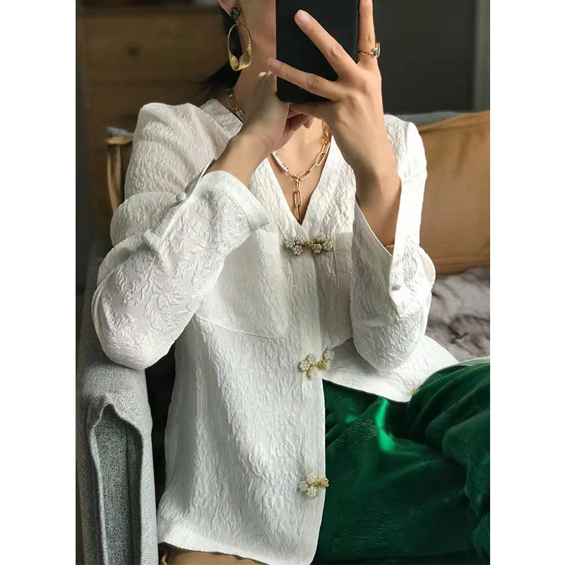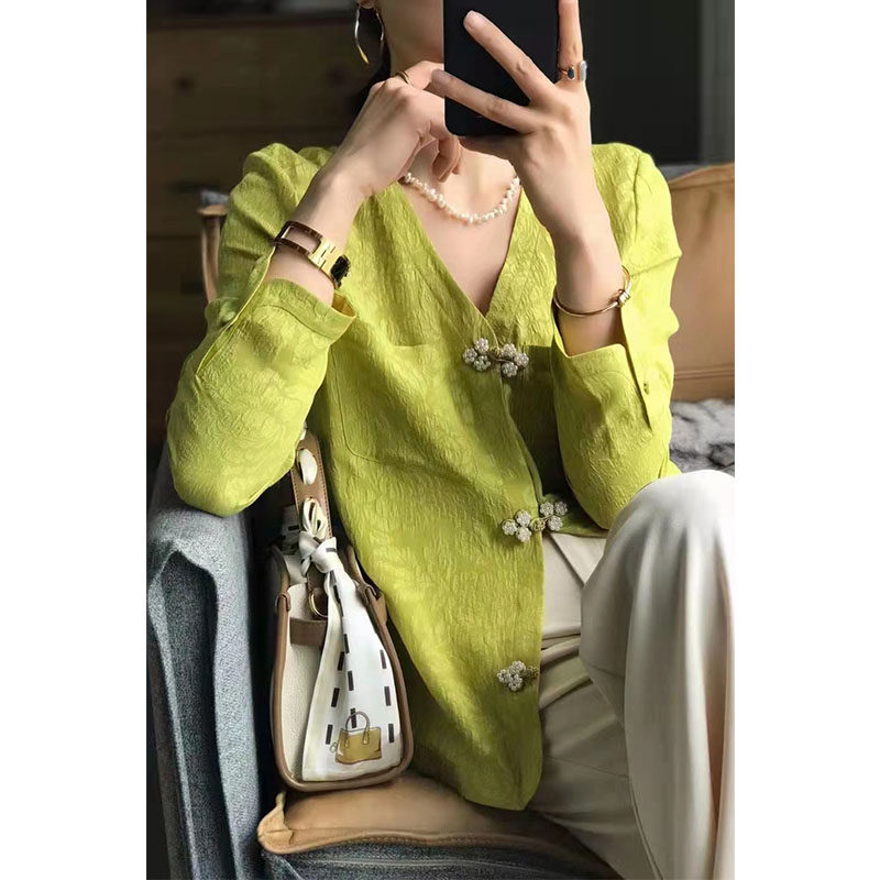 European Station Spring Festival European goods temperament V collar Chinese style disc buckle jacquard shirt high-end light lavish Chinese wind green blouses