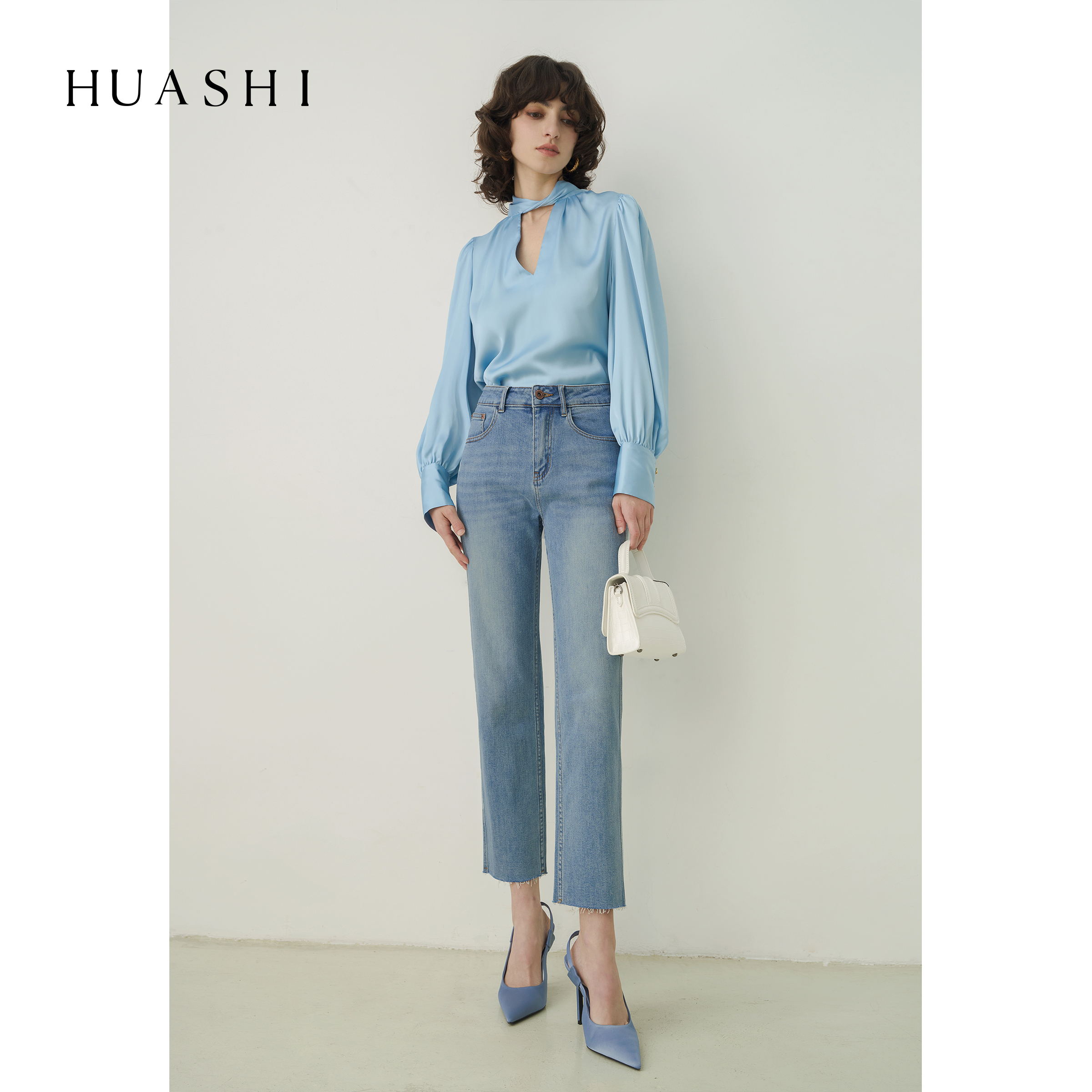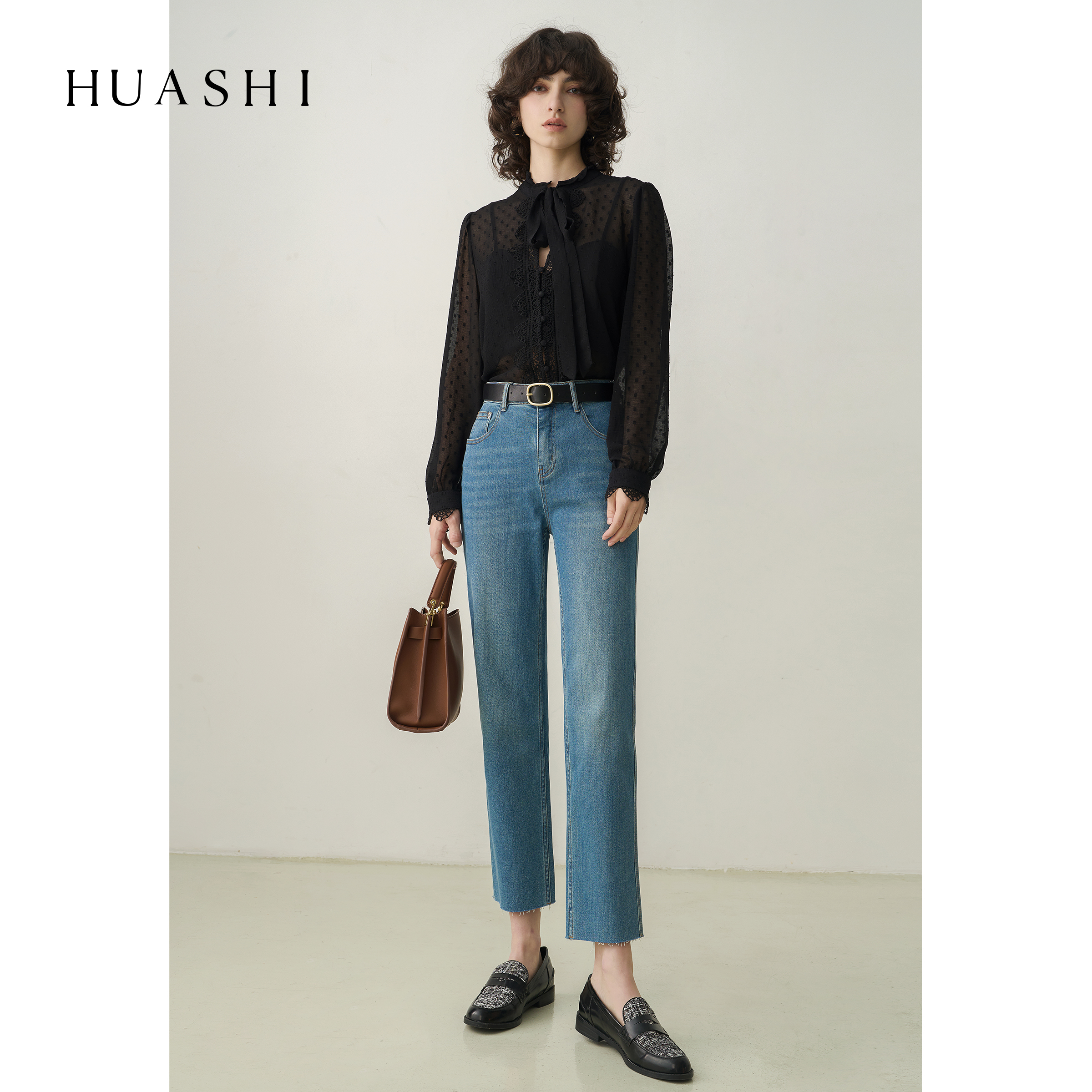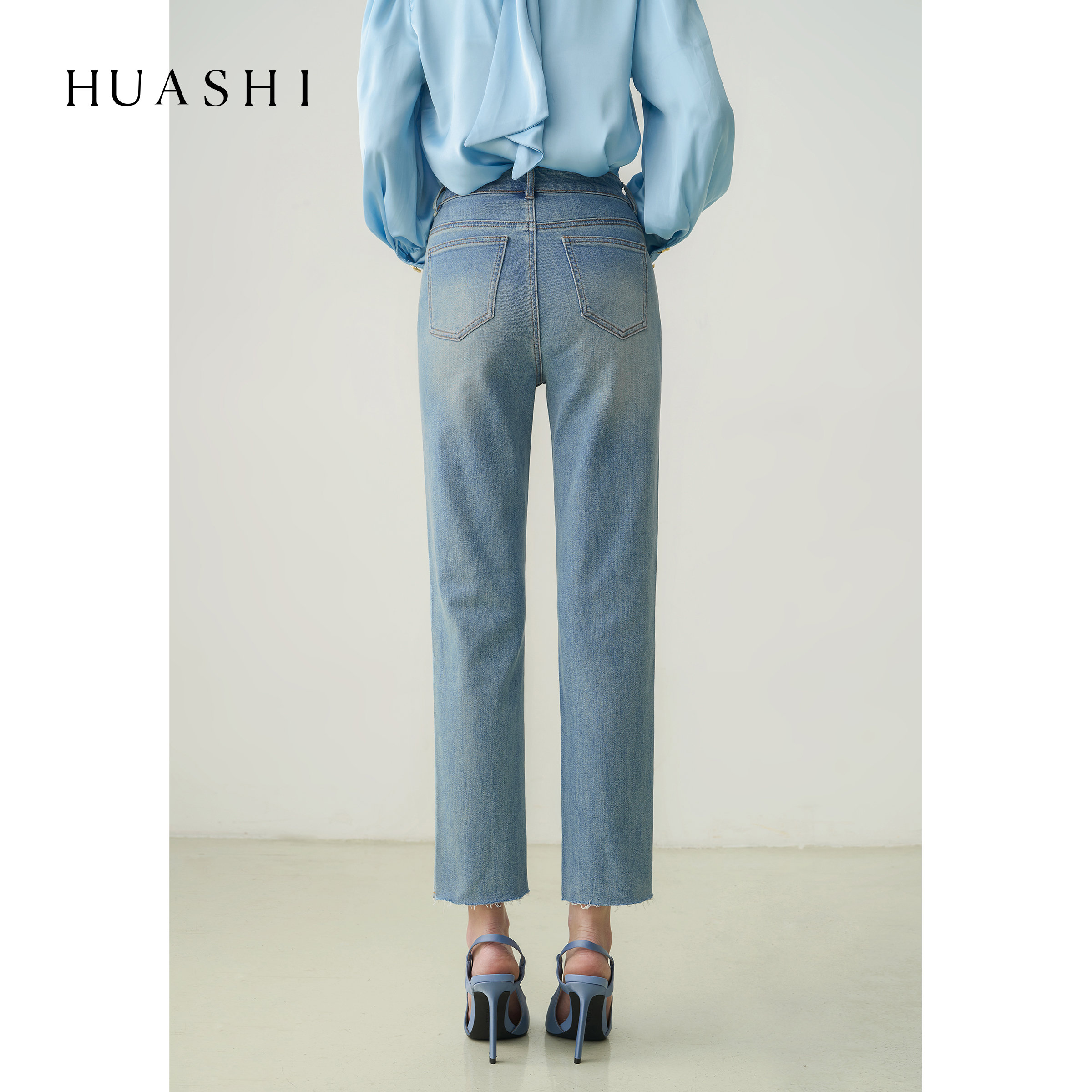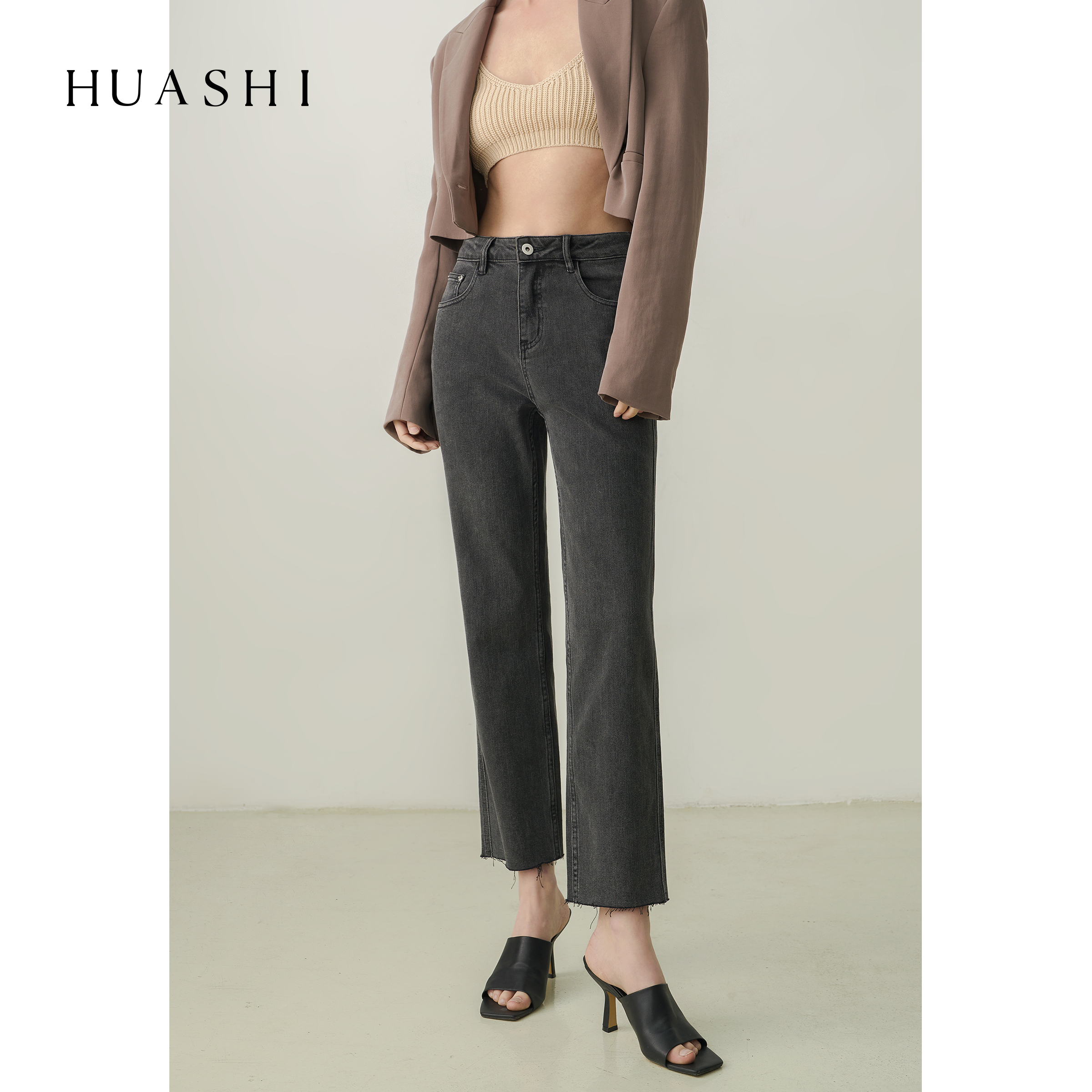 HUASHI painted grey raw edge straight-leg jeans women's high waist slim loose cropped baguette pants 81182