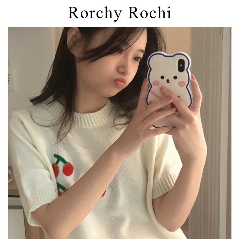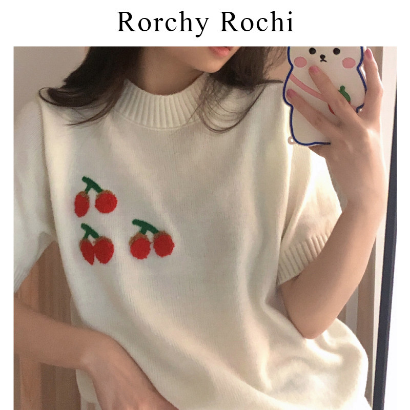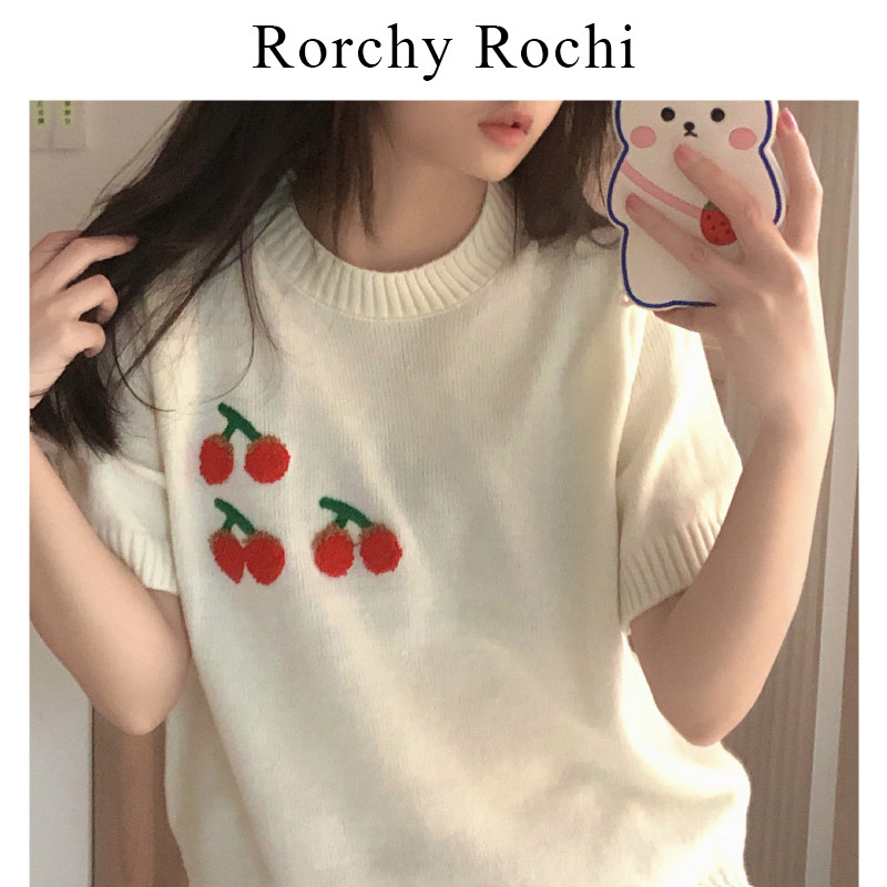 Japanese white T-shirt women 2022 summer new round neck loose short sleeve cherry design feeling niche knit top