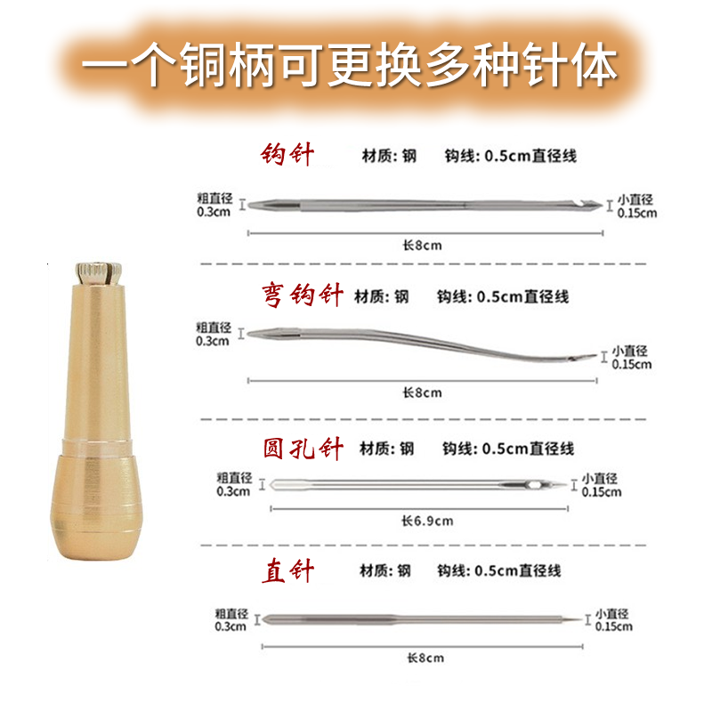 1 copper handle, 1 straight needle, 1 copper handle, 1 crochet needle, 1 copper handle, 1 round hole needle, 1 copper handle, 1 curved crochet needle, three crochet needles, three round hole needles, three curved crochet needles, three four kinds of needles, one copper handle, four kinds of needles