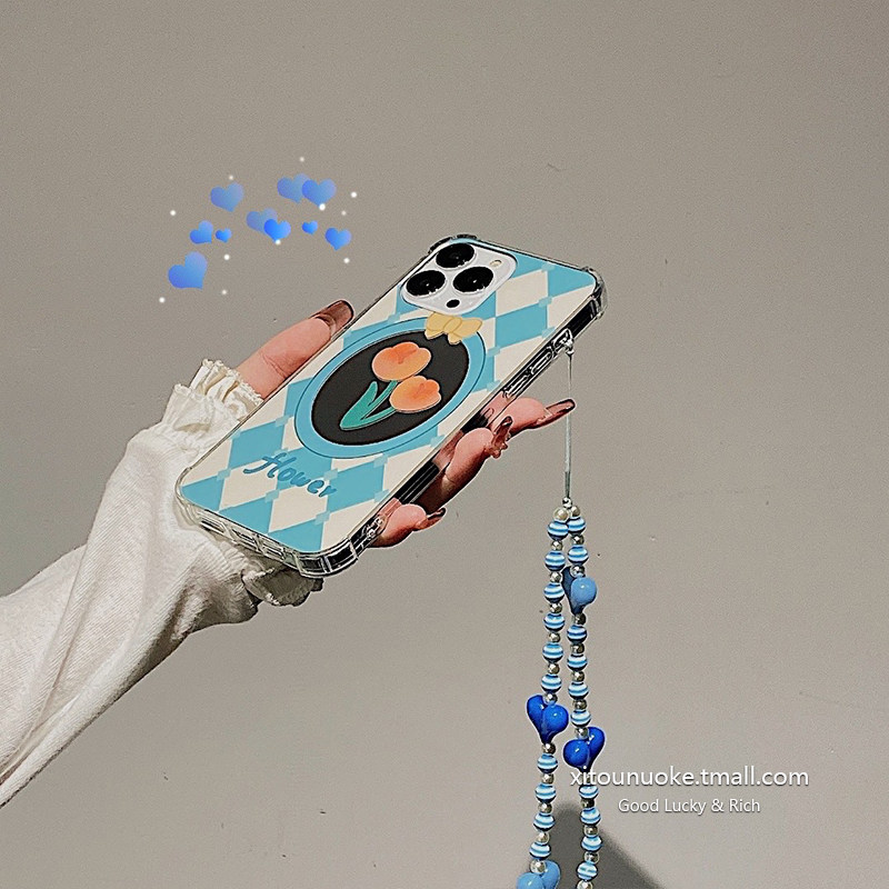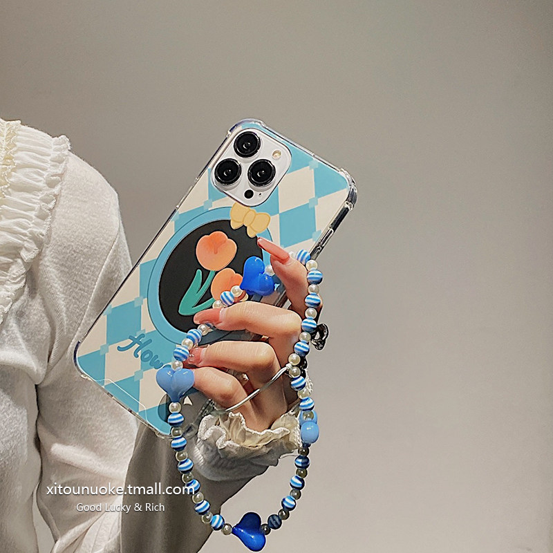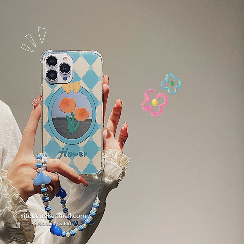 Sky Blue Rhombus Flowers iphone13 Apple Mobile Phone Shell 12pro Make-up Mirror 11 Strings Beads Hand Alchemist Xsmax Xr Xiaoqing New Fashion Girl's New All-bag Anti-Fall Protective Sleeve