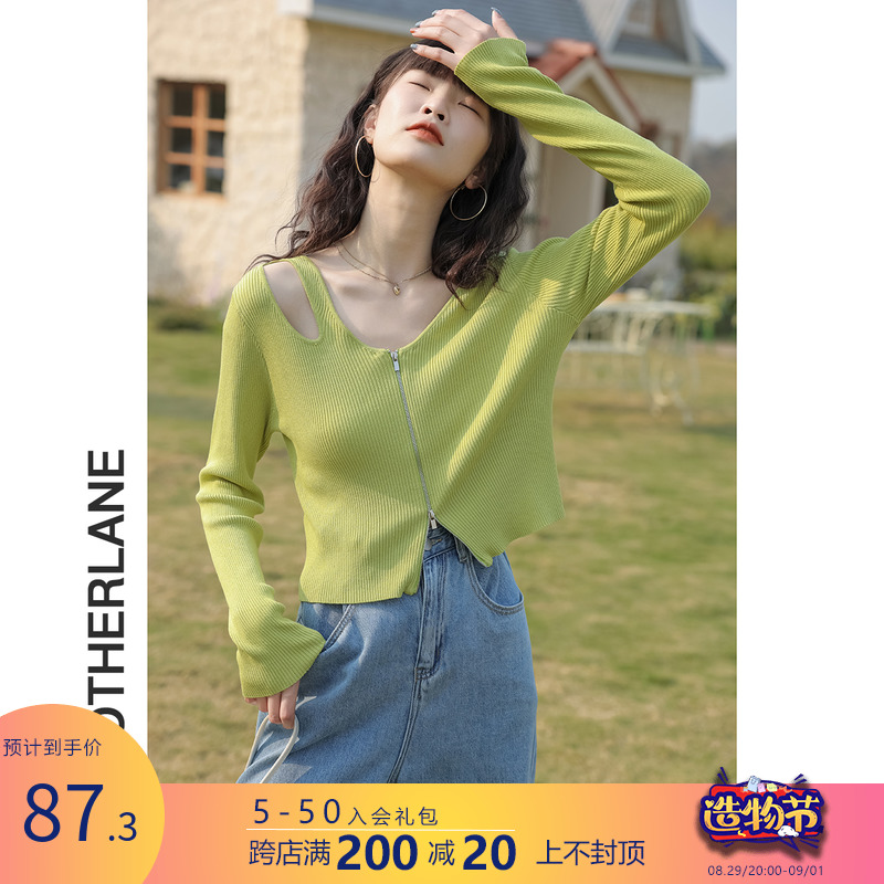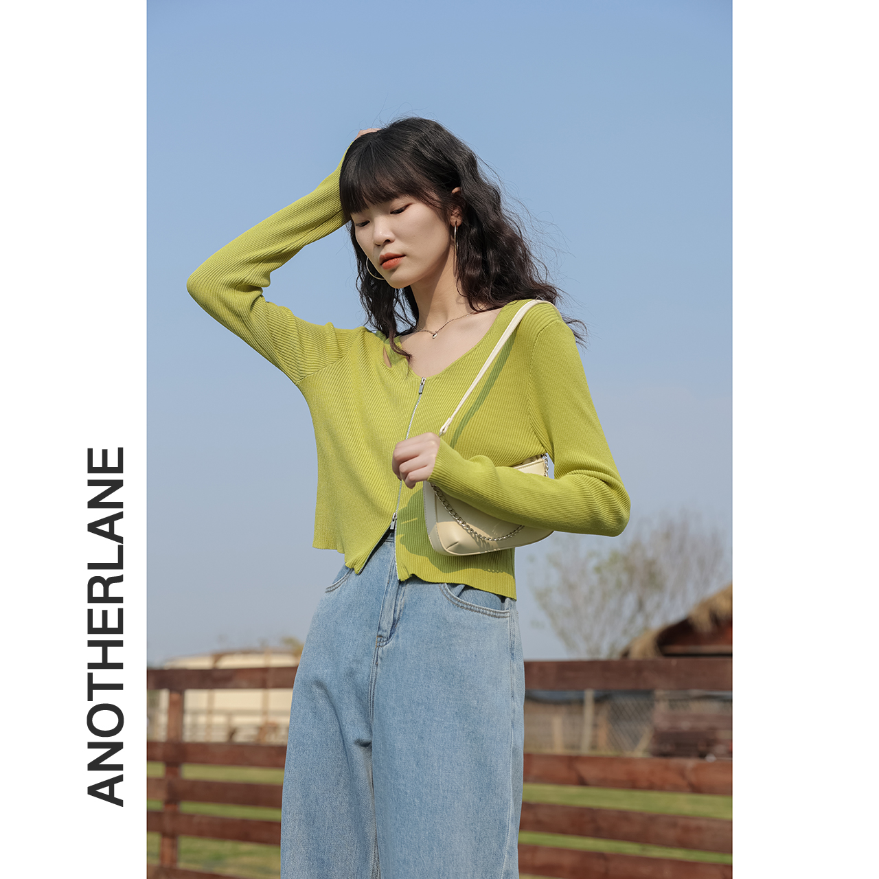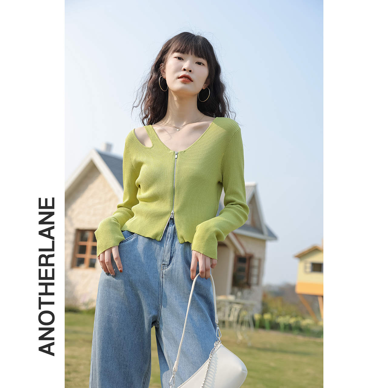 "back alley" little fresh and sweet blouse 2022 spring and summer green short V collar hollowed-out long sleeves knit cardiovert woman