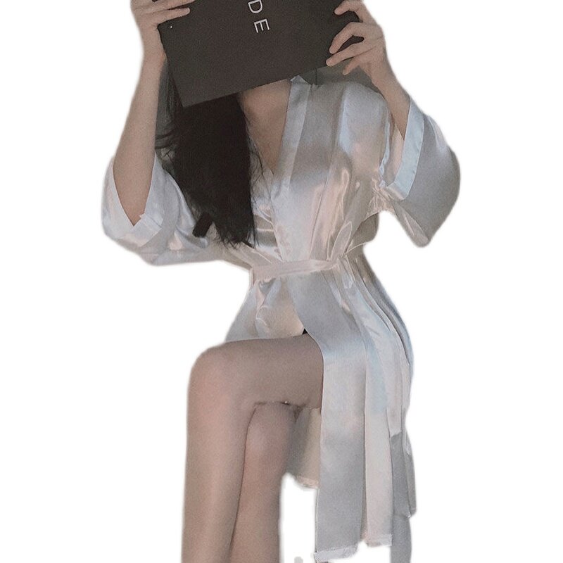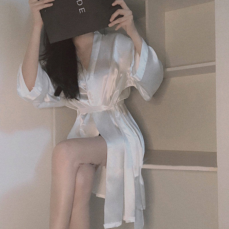 Pure desire sexy ice silk nightgown ladies spring and autumn long-sleeved kimono lace bathrobe four seasons universal dressing gown white