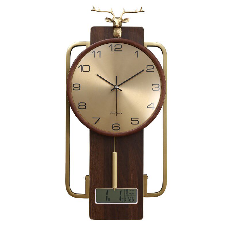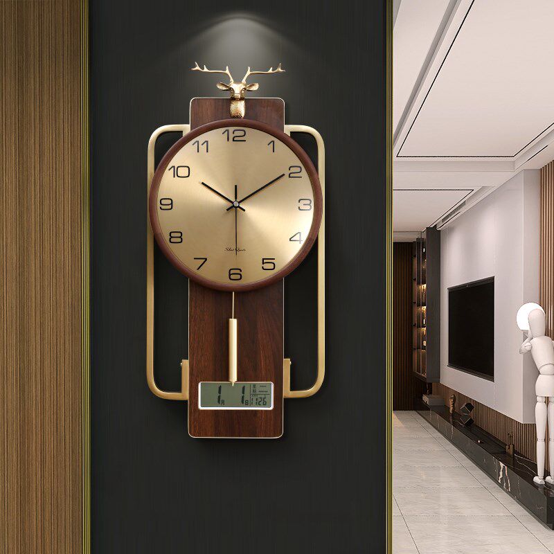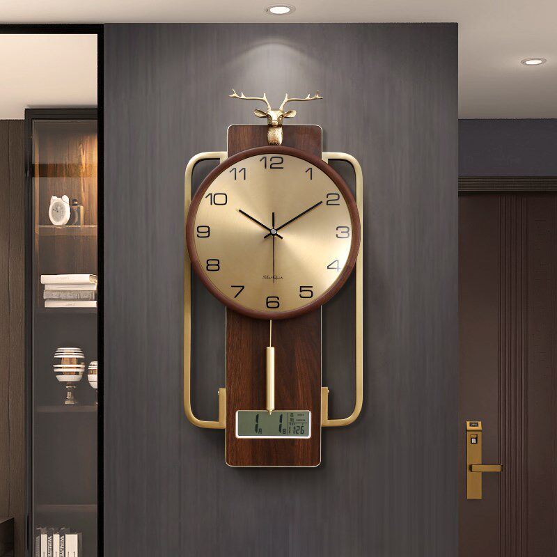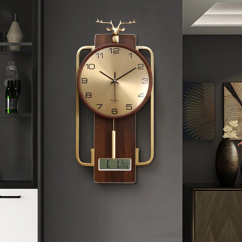 New Chinese foe deer hanging clocks Home mute fashion Decorative Clock Living Room Light Lavish Walnut Wood Atmospheric Brass Clocks