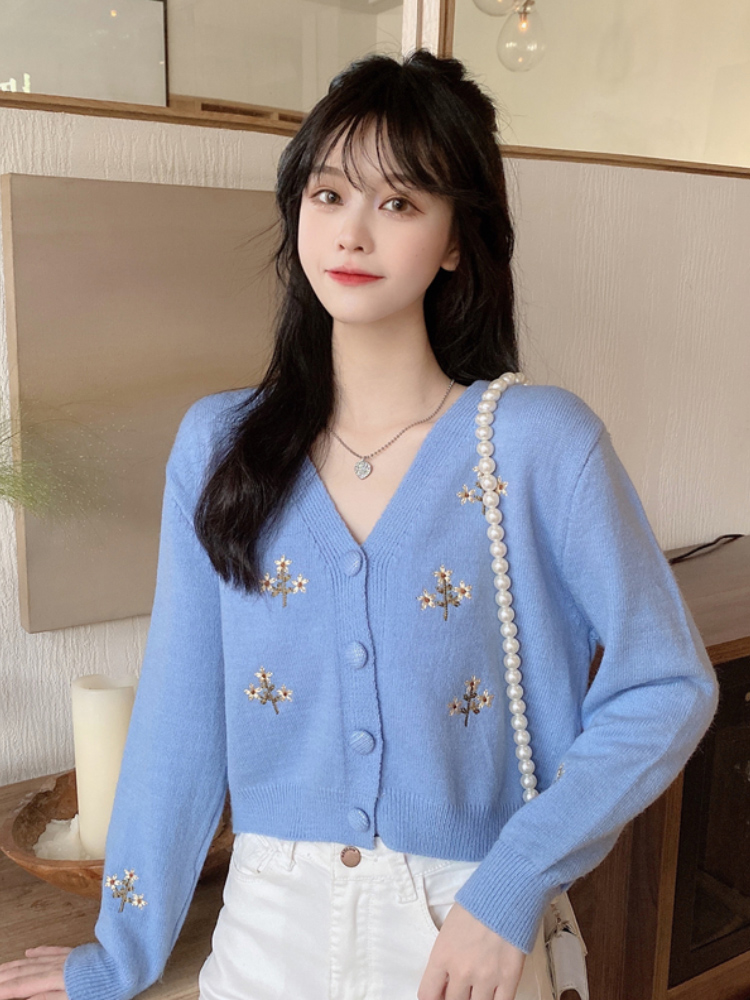 Spring and Autumn v-collar Short Small Small Small Design Sense-Yang Embroidery Loose Outside Wear Clothes