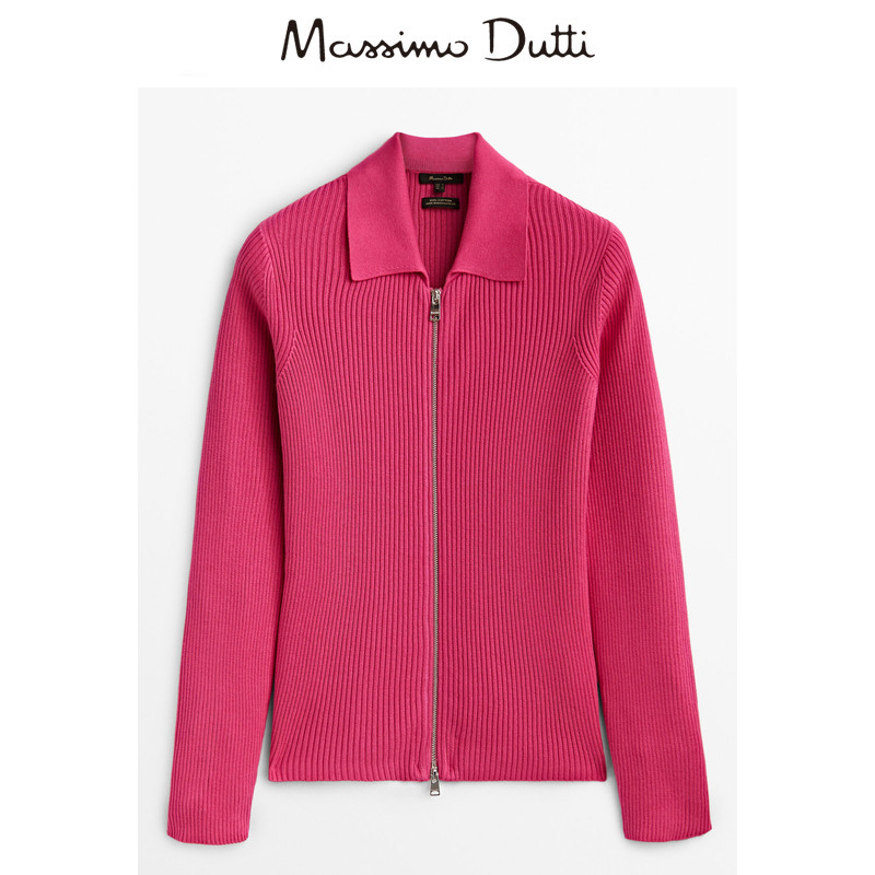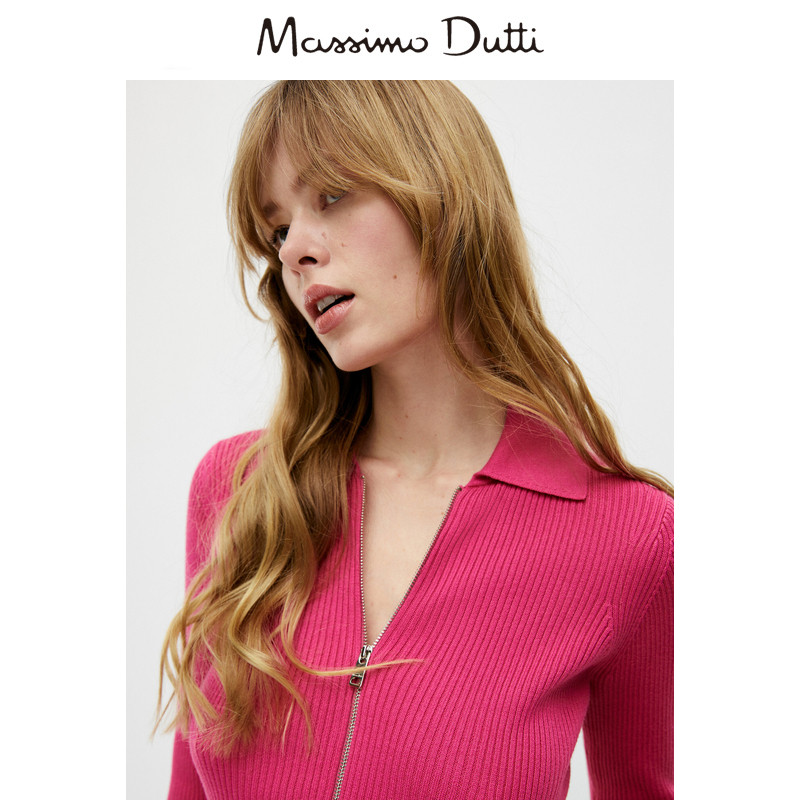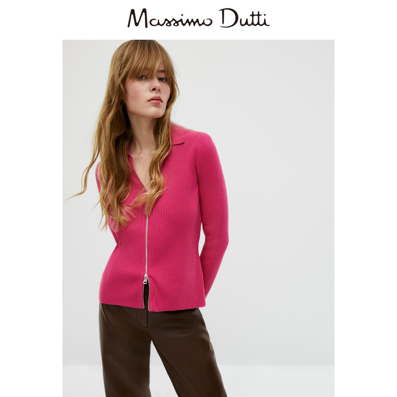 Mid-year Massimo Dutti womens Rose red slim zipper design solid color polo neck knit cardigan 05674532665