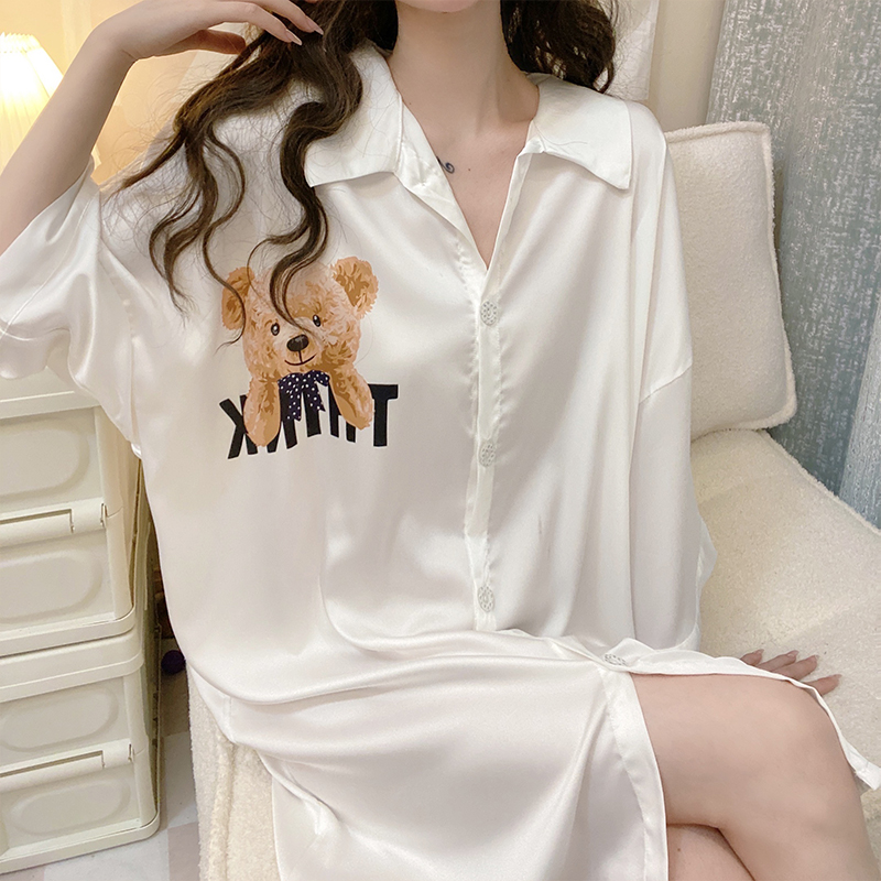 Ice silk white shirt boyfriend sleeping skirt female summer sleeve cute thin large size loose animated pajamas