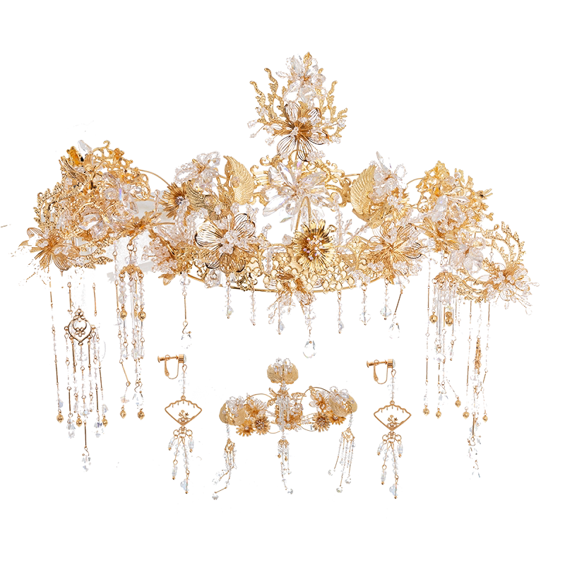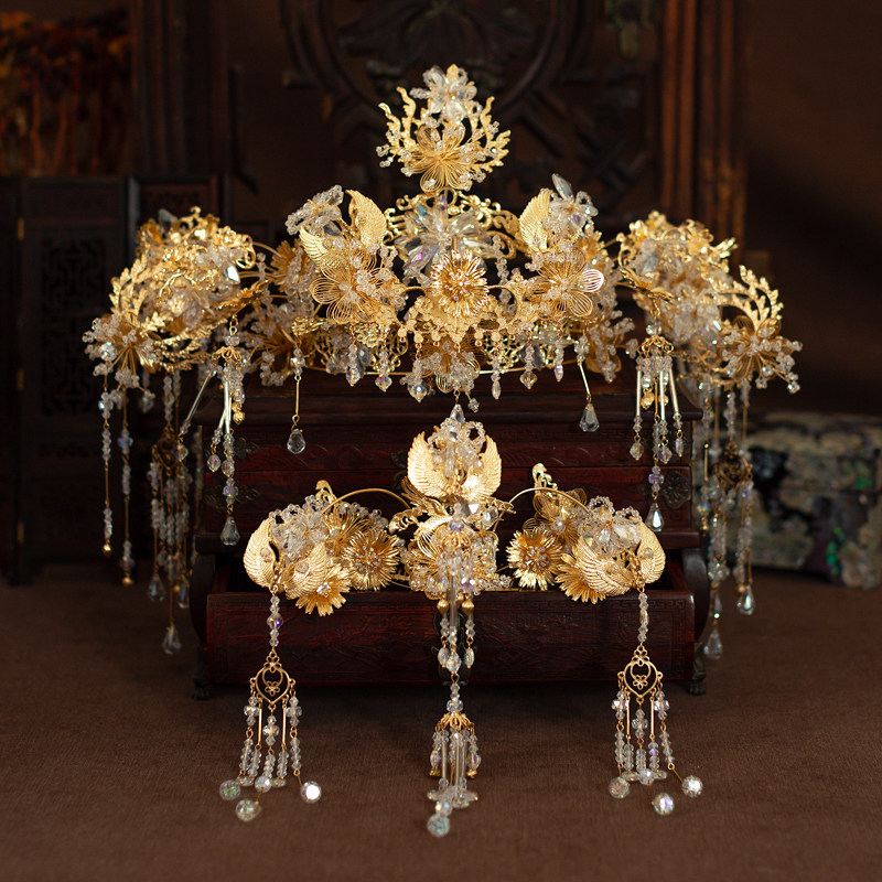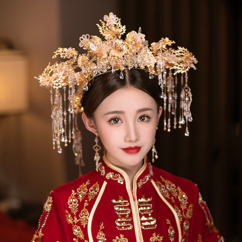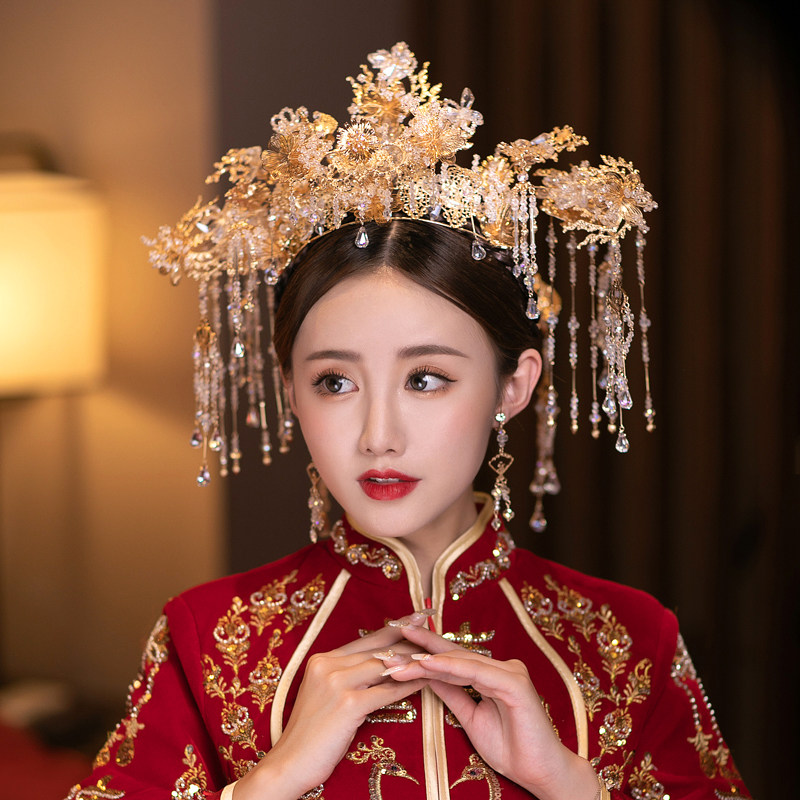 Bride's head decorated with new golden crystal beads Long stream Su Chinese ancient dress knot wedding show and alloy hair adorned with celluloid cloud