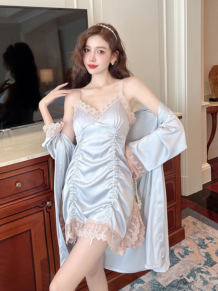 Japanese high-end pajamas female sense spring and summer ice silk thin section lace suspenders nightdress silk nightgown two-piece set