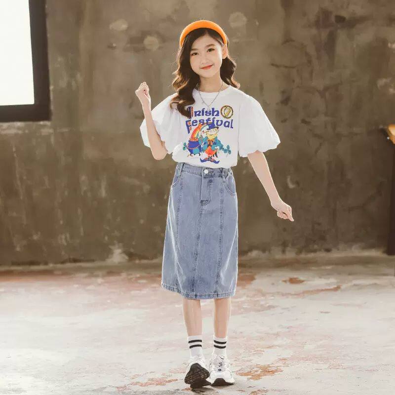 Girls net red fried street suit summer 2022 new middle and big children Korean version denim skirt puff sleeve cartoon T-shirt two pieces