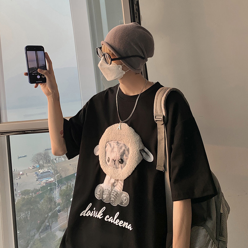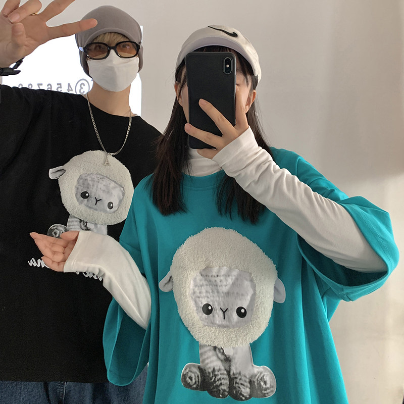 Lake green alpaca T-shirt women's design sense niche couples front shoulder short sleeves oversiz chic and thin three-quarter sleeves