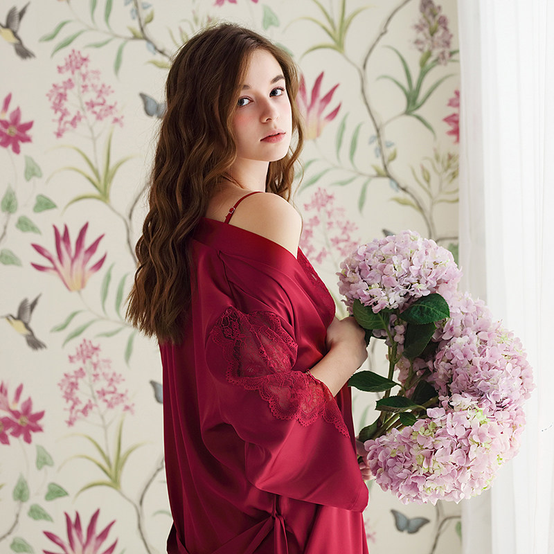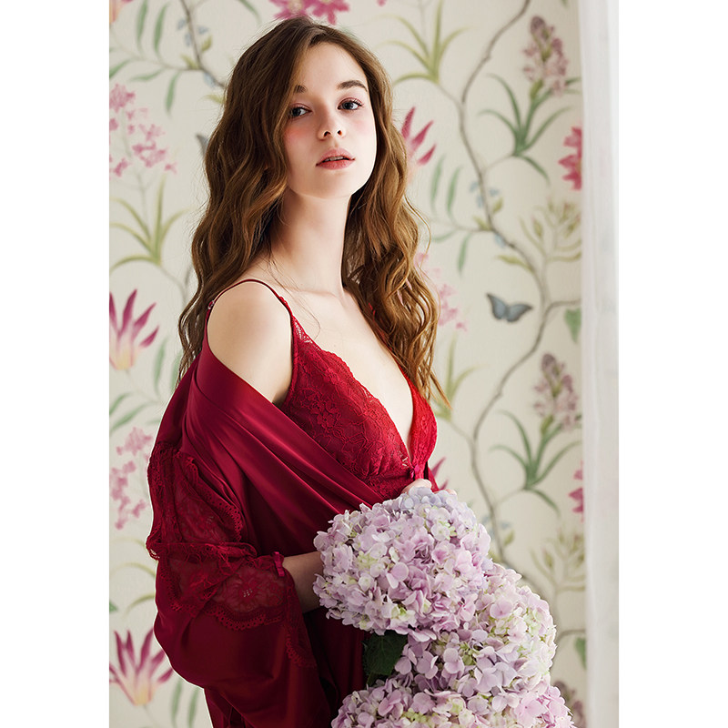 Sexy Lace Harnesses Deep V Pyjamas Red Dew Dorsal Pyjamas Woman Ice Silk Sleepwear Bride Wedding Morning Gown Two Sets