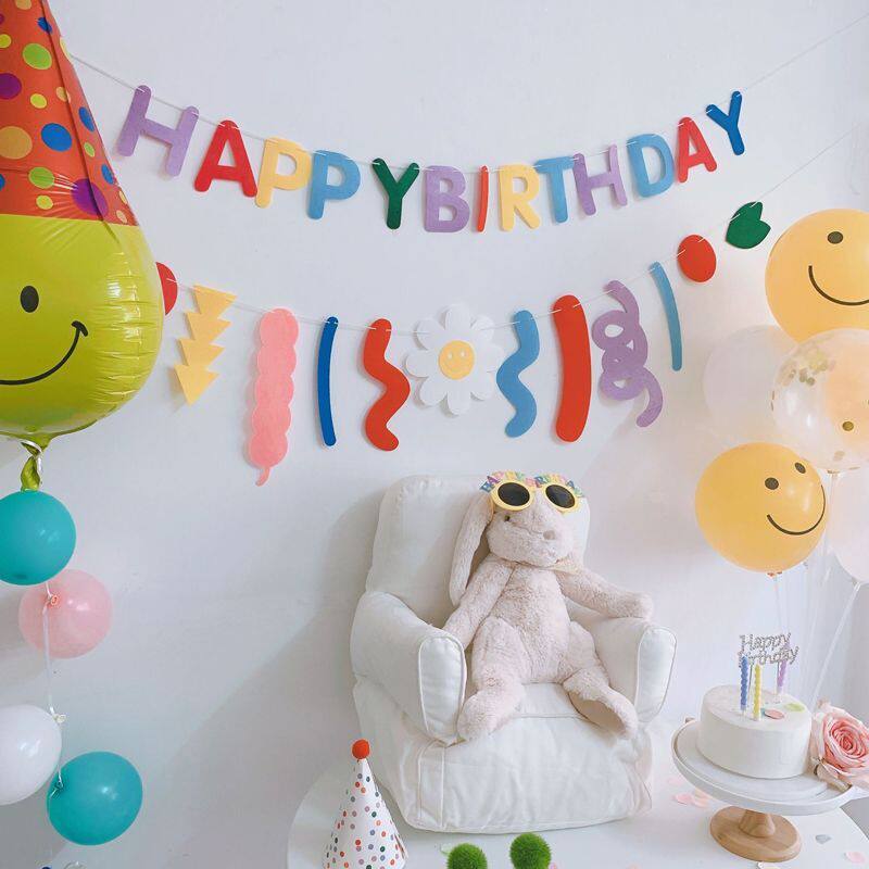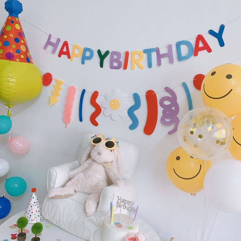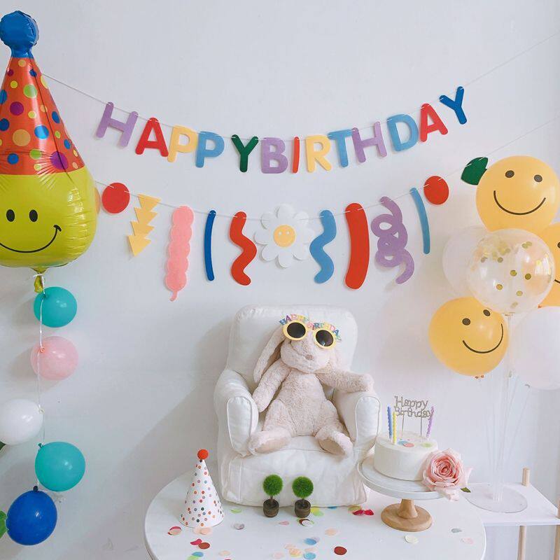 happybirthday rolled-flag smiling face cap 5 small balloons Ribbon-faced tables (containing balloons) as a picture set with a birthday glasses pink and a pair of birthday glasses yellow